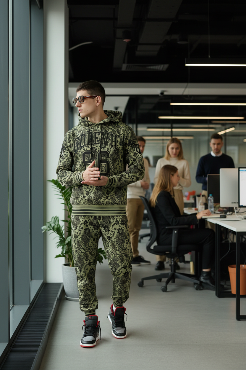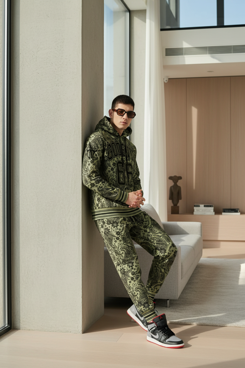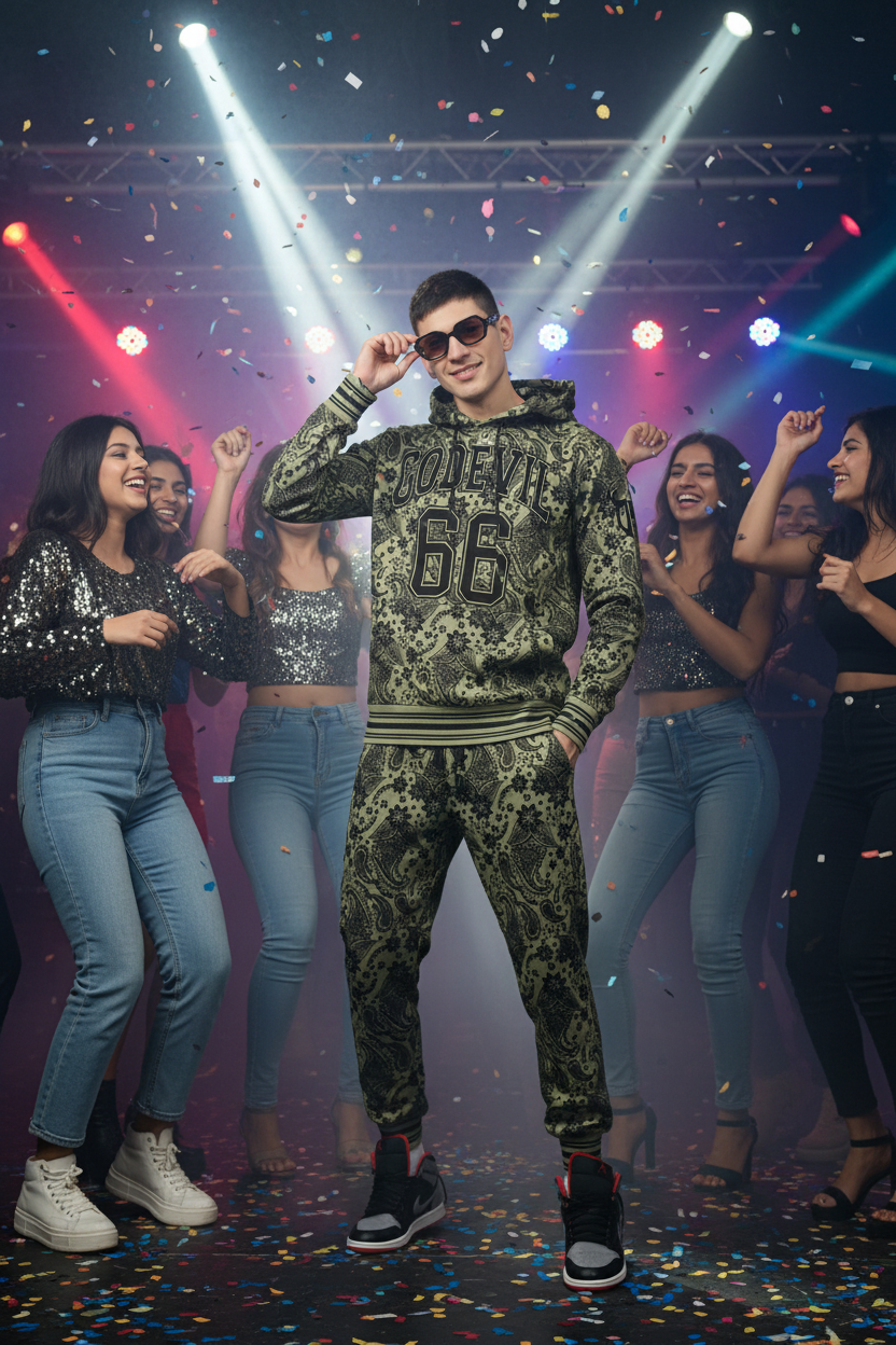 Go Devil 66 & Paisley Design Printed Sage Green Hooded Cord Set for Men