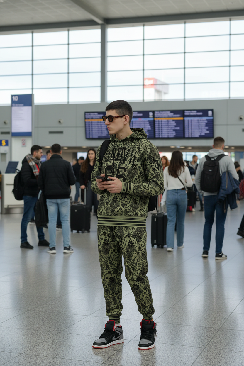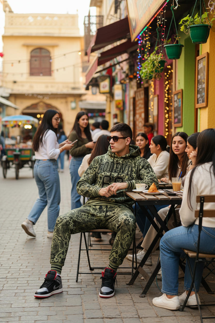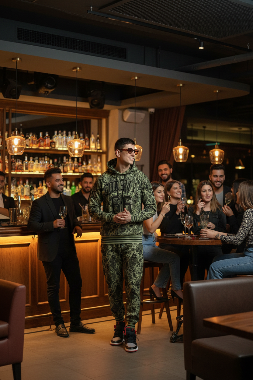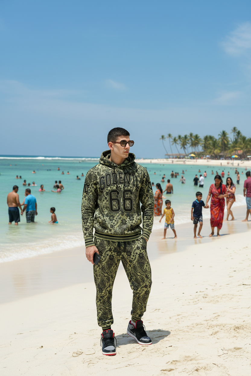 Go Devil 66 & Paisley Design Printed Sage Green Hooded Cord Set for Men