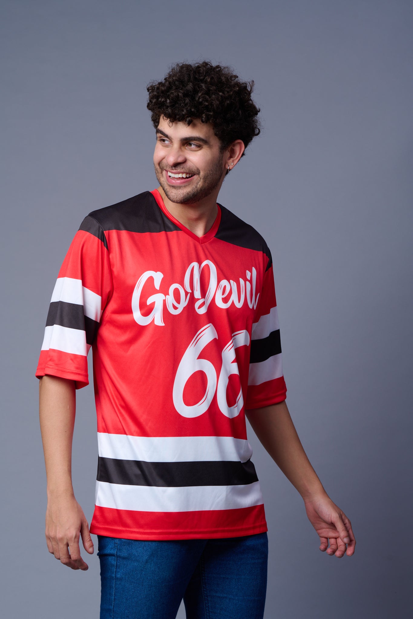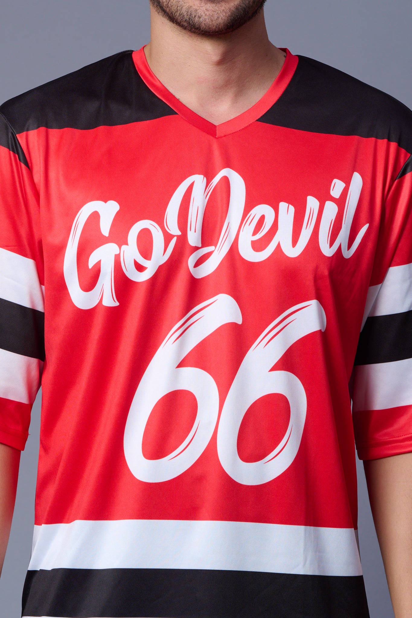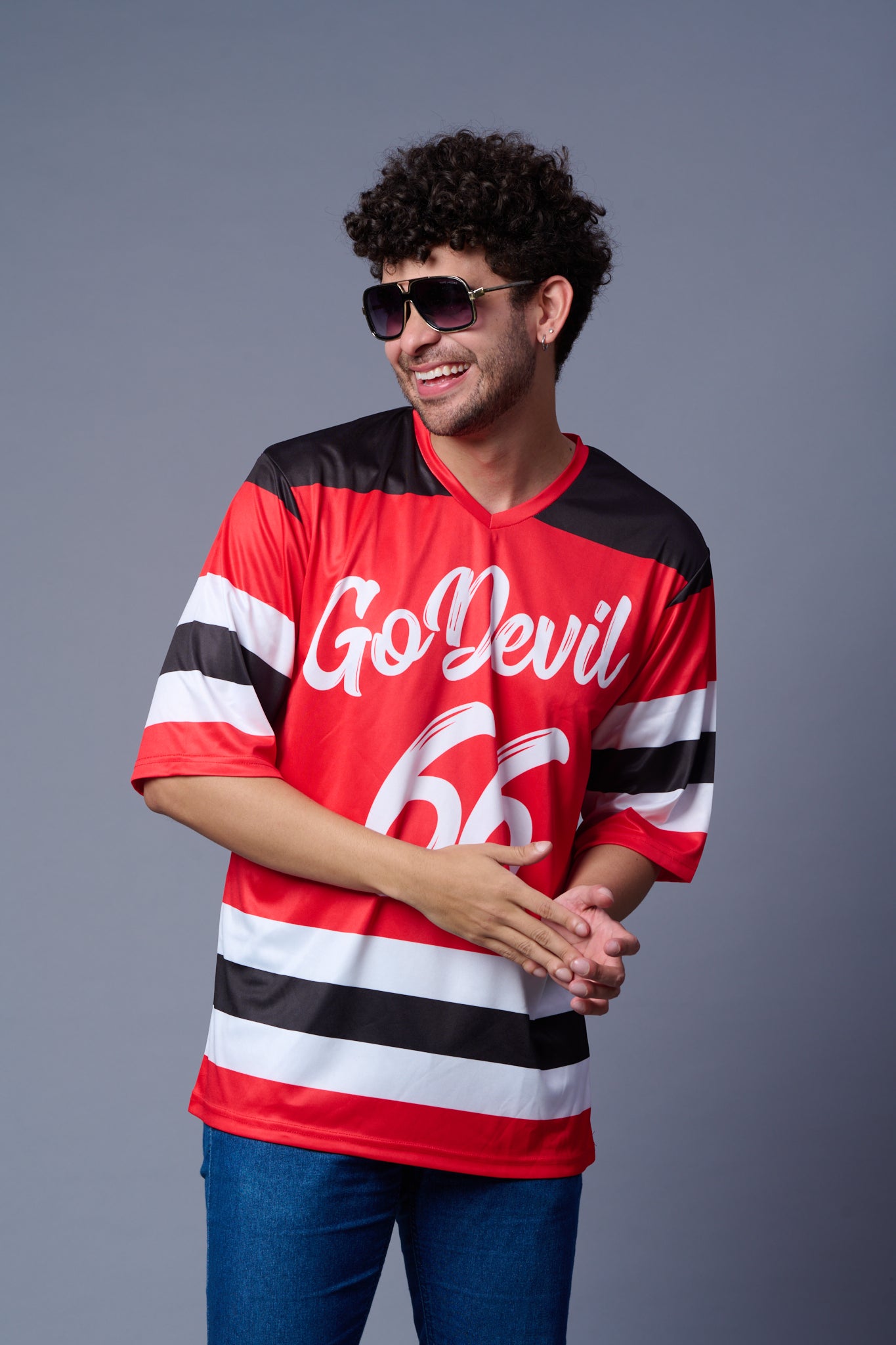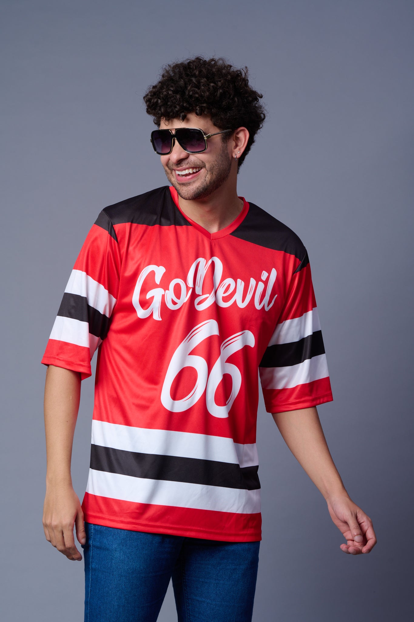 Go Devil 66 Striped (In White) Printed Red Oversized Jersey T-Shirt for Men