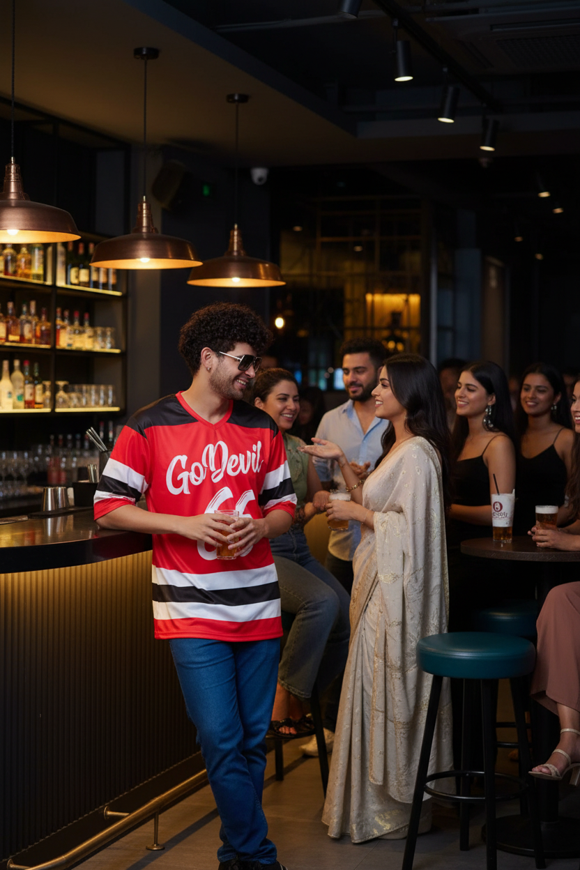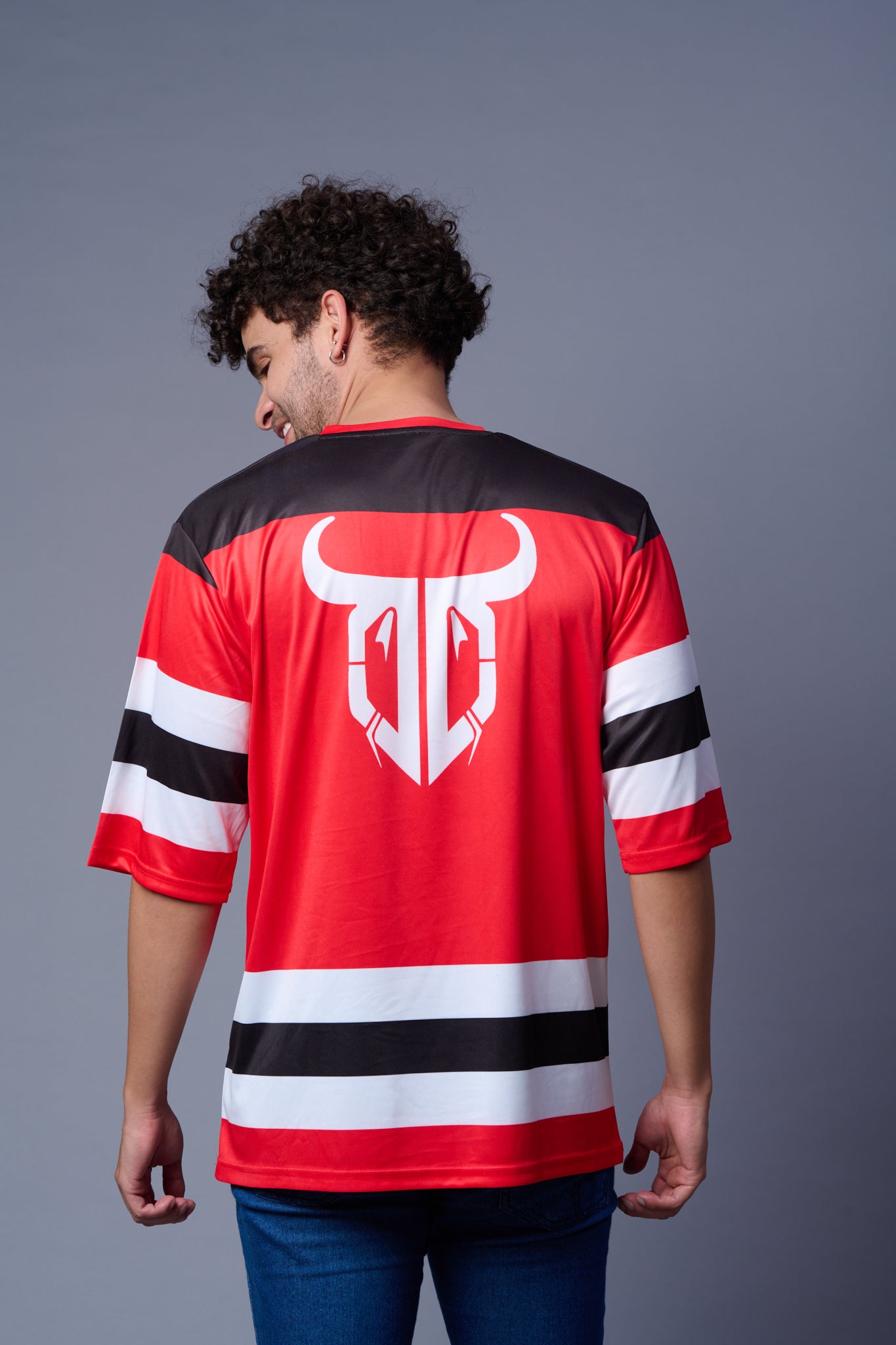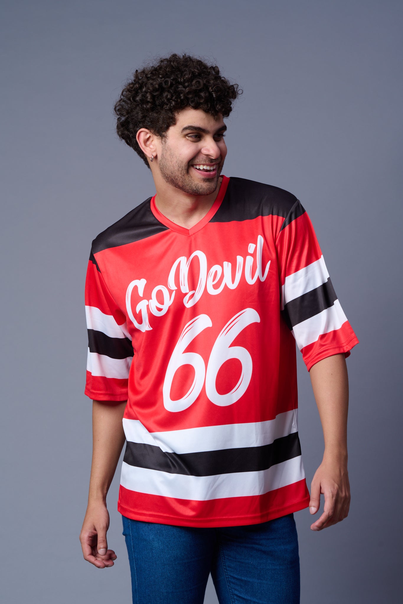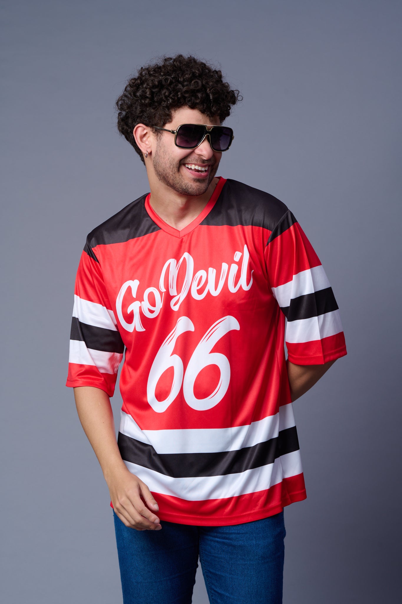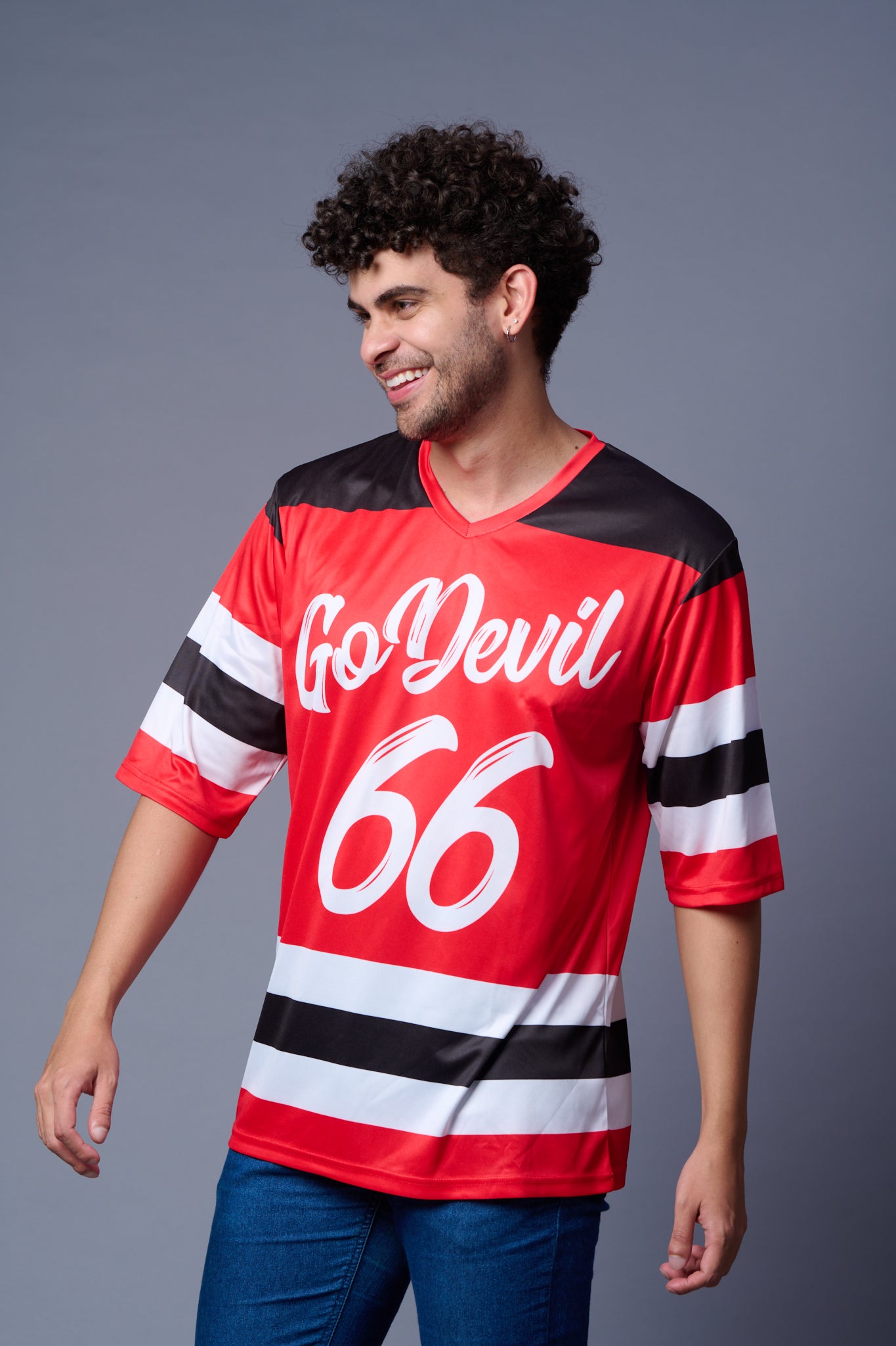 Go Devil 66 Striped (In White) Printed Red Oversized Jersey T-Shirt for Men