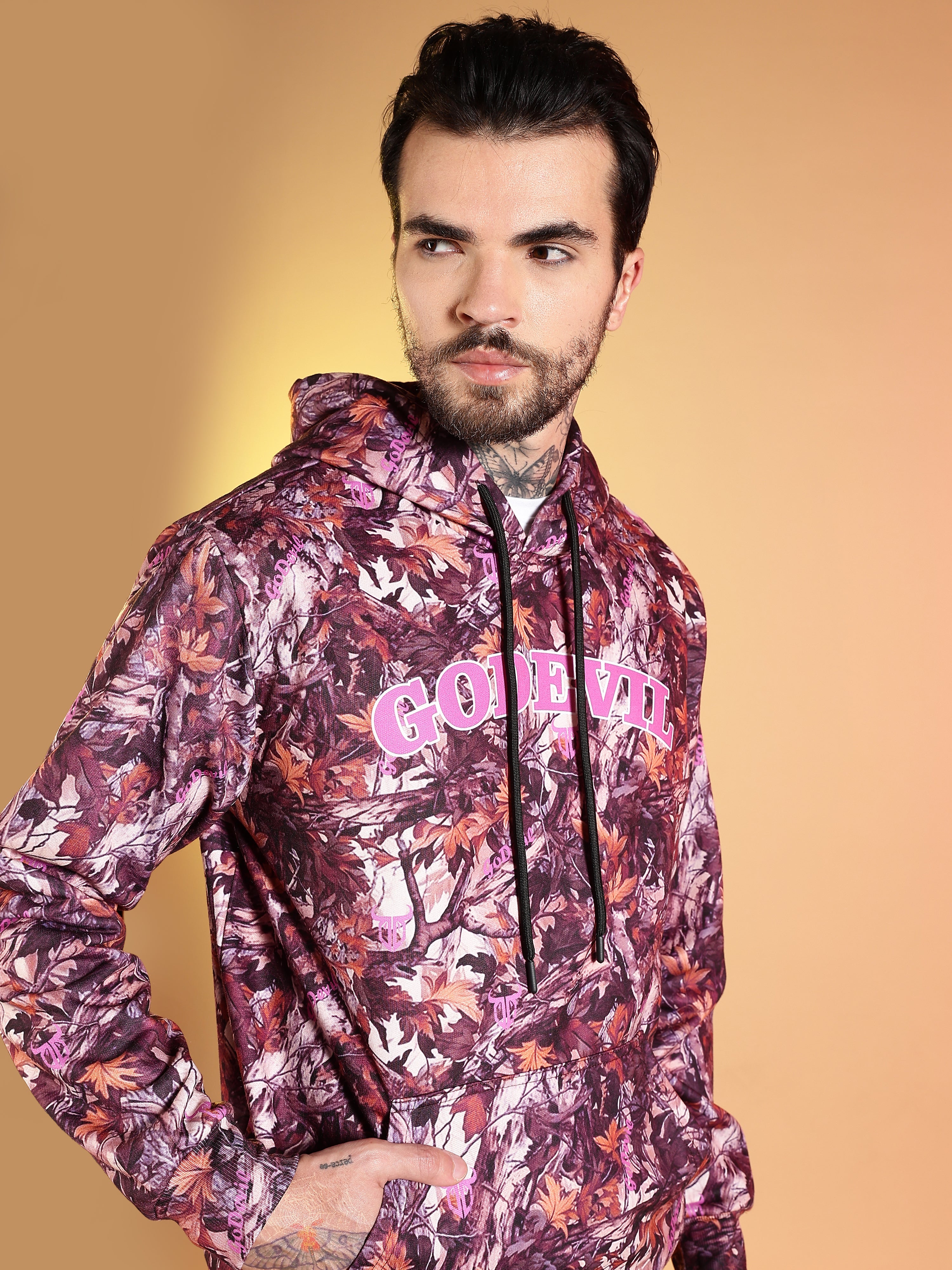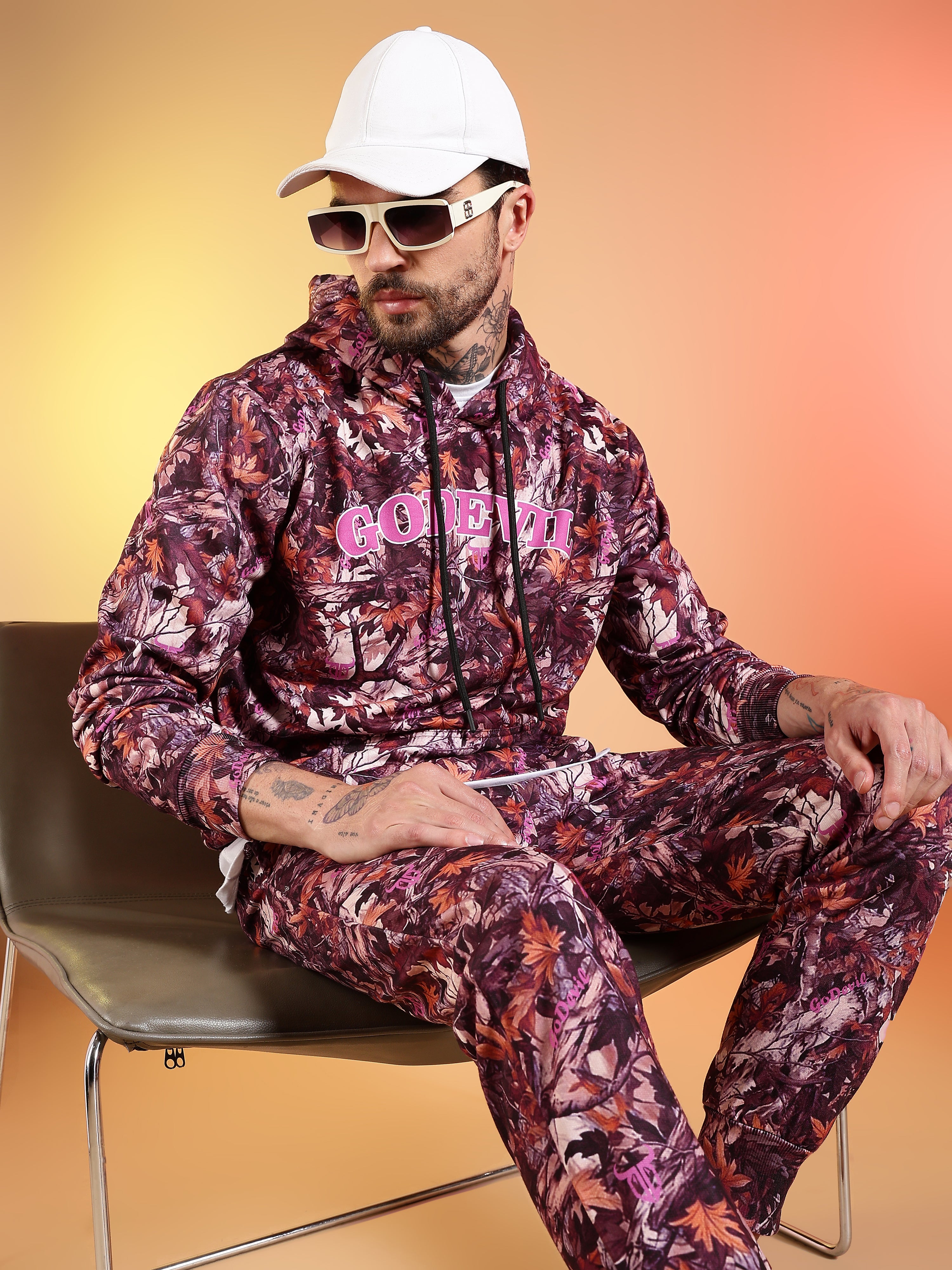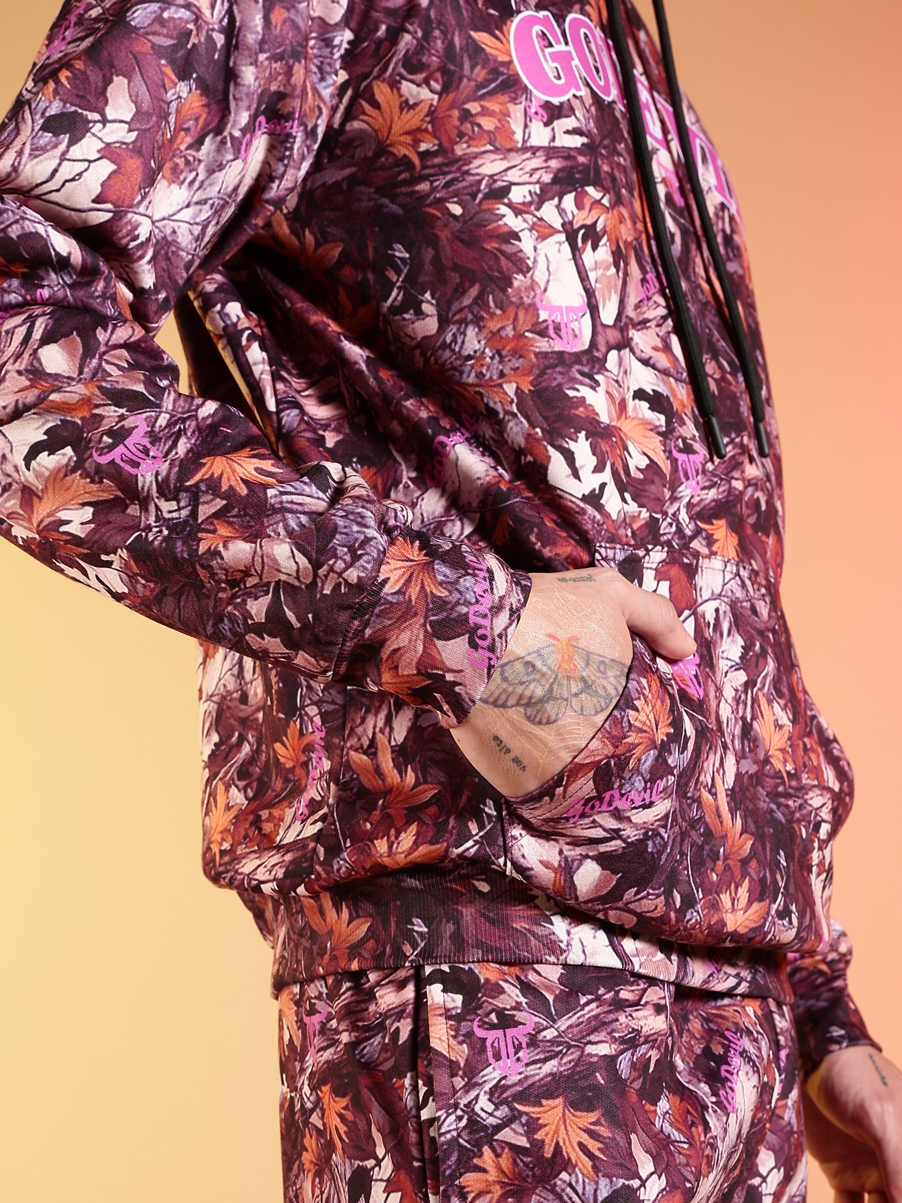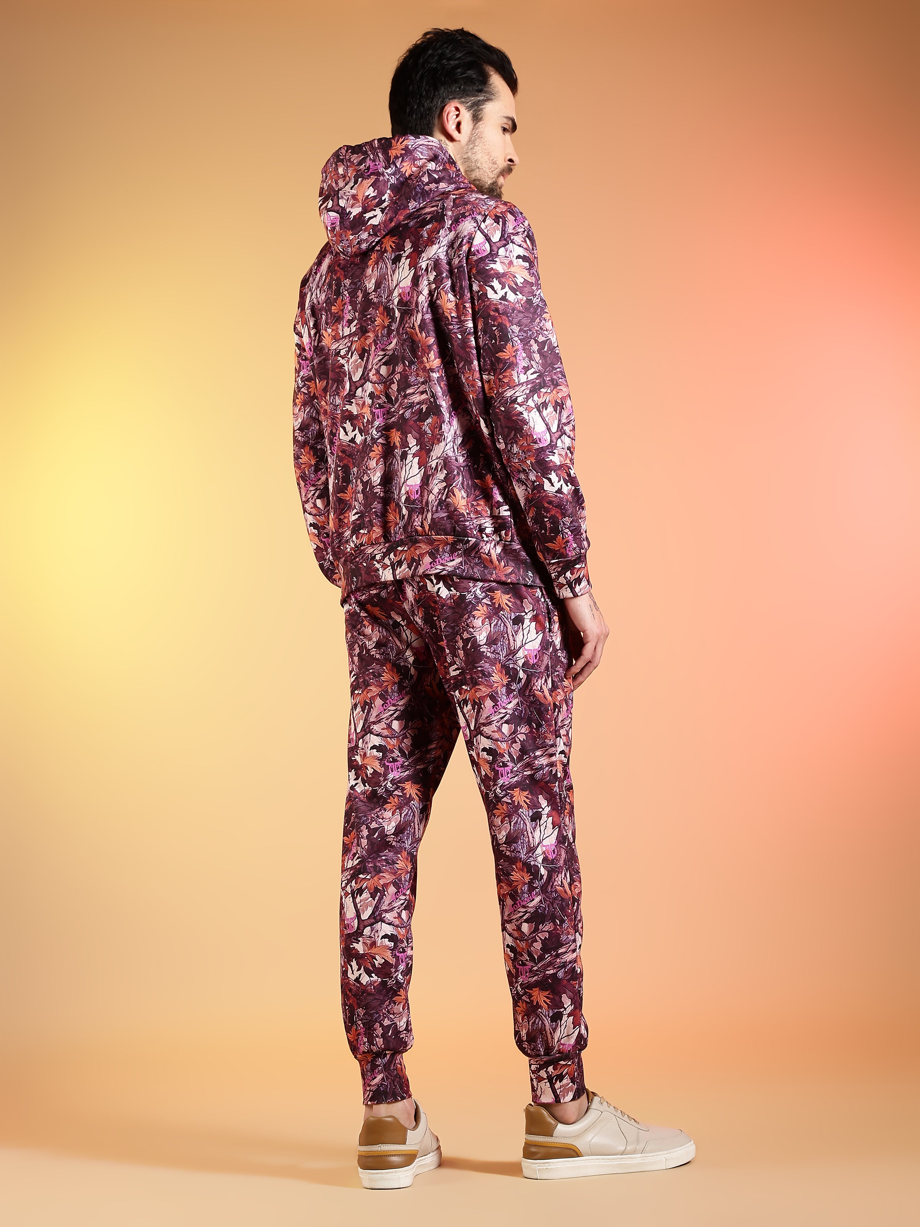 Go Devil Maroon Abstract Print Hooded Co-Ord Set for Men
