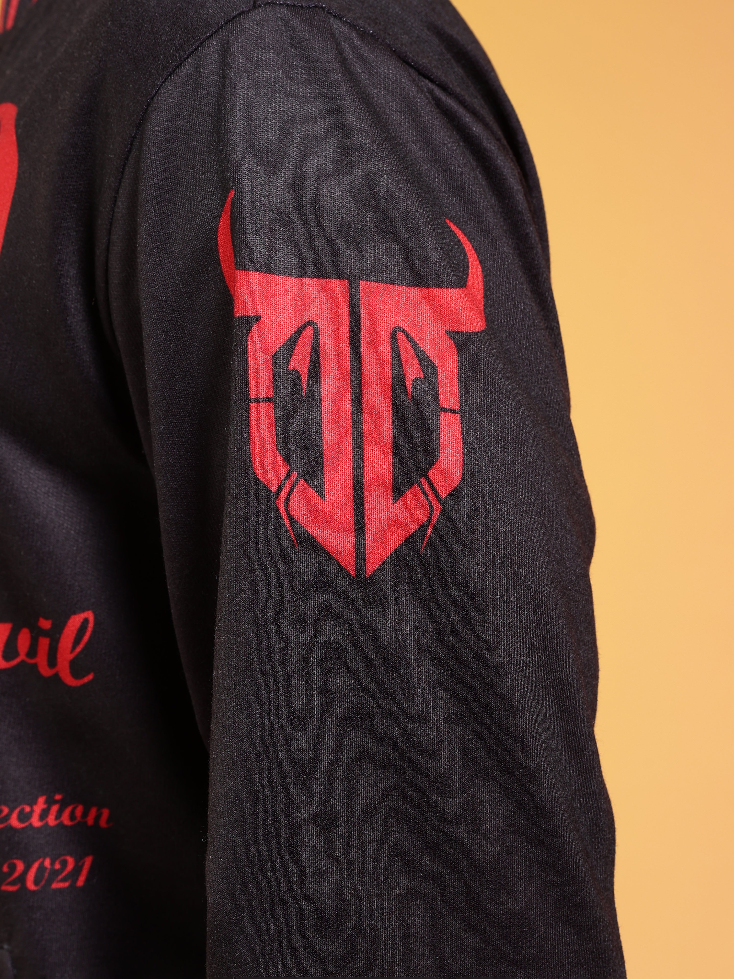 Chinese Devil in Red Foil Print Black Oversized T-Shirt for Men
