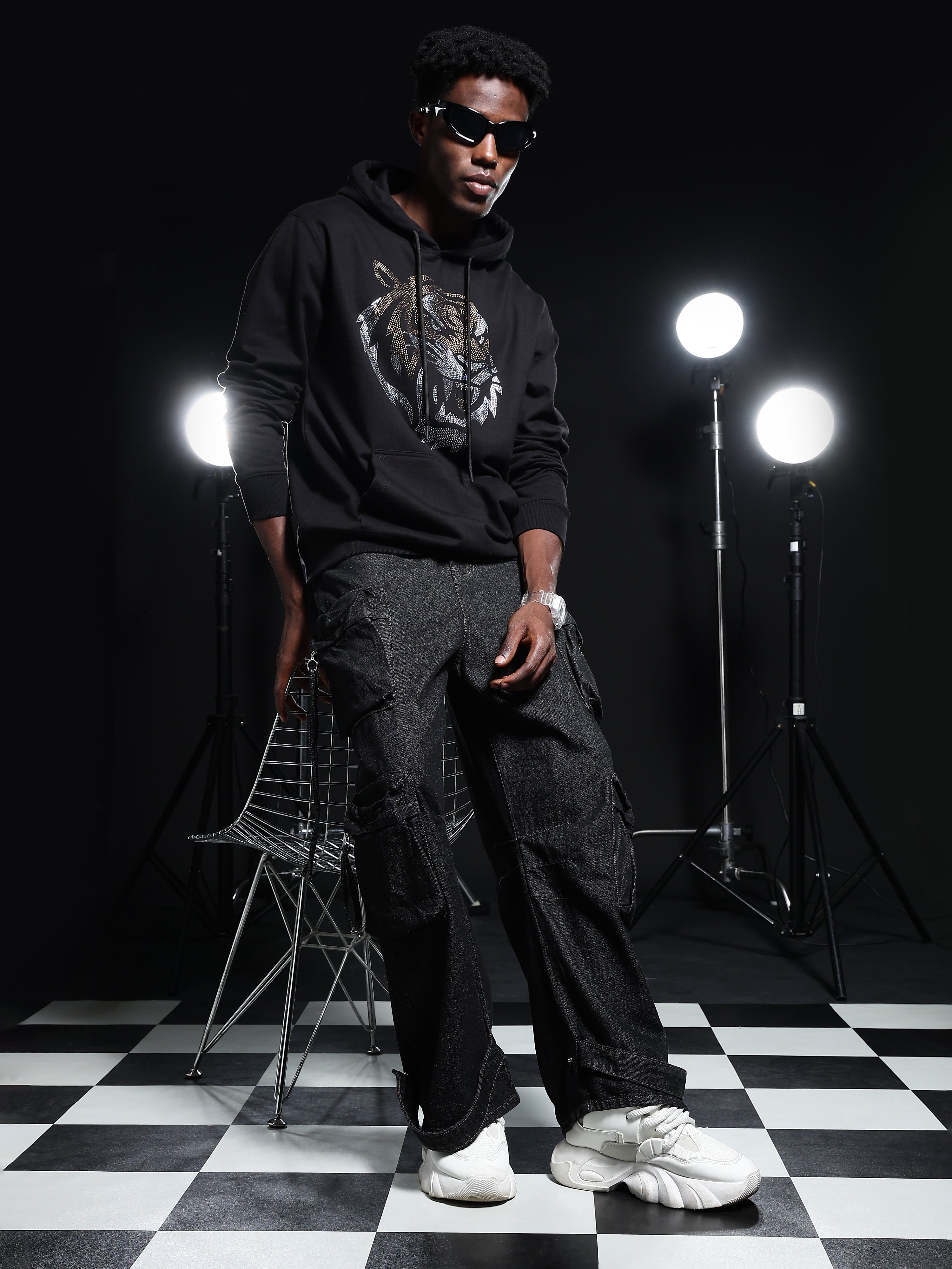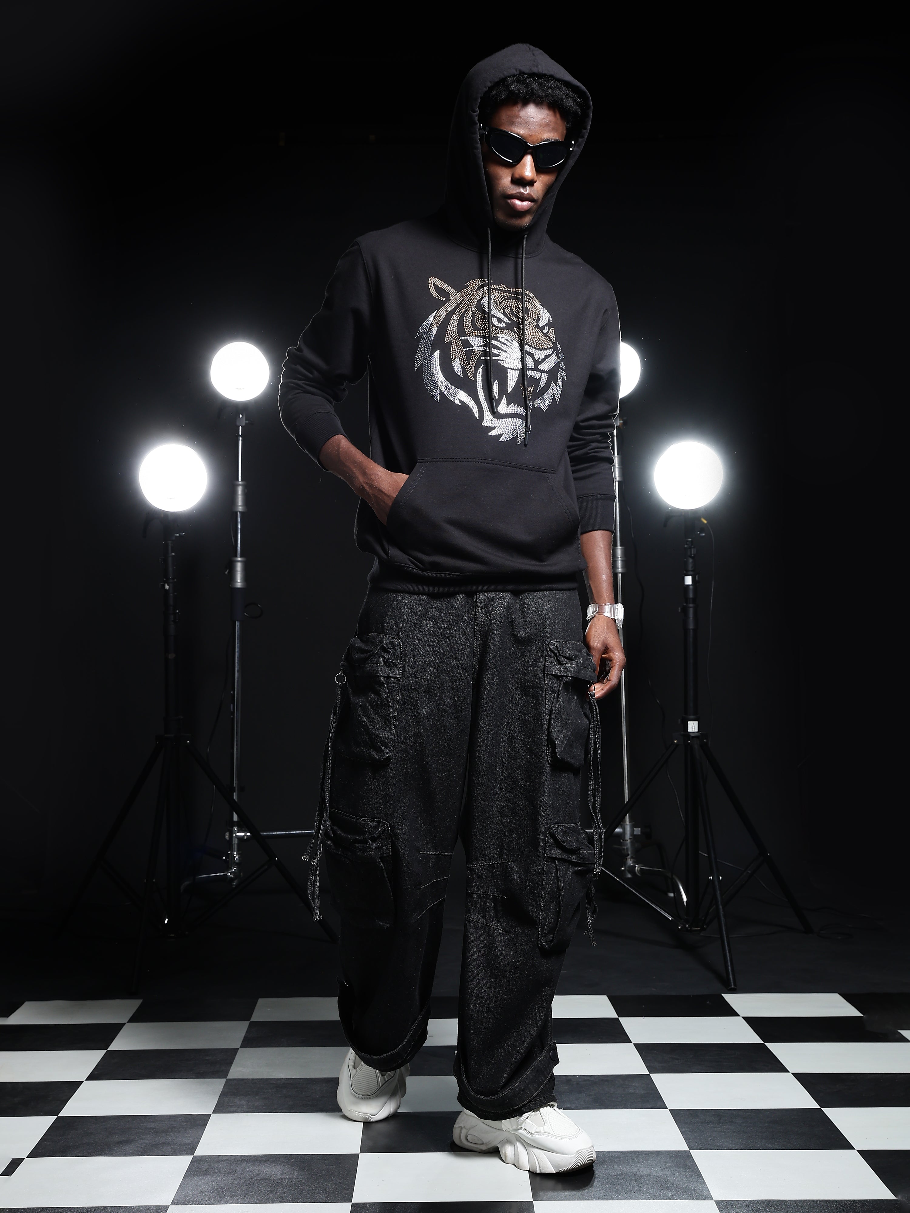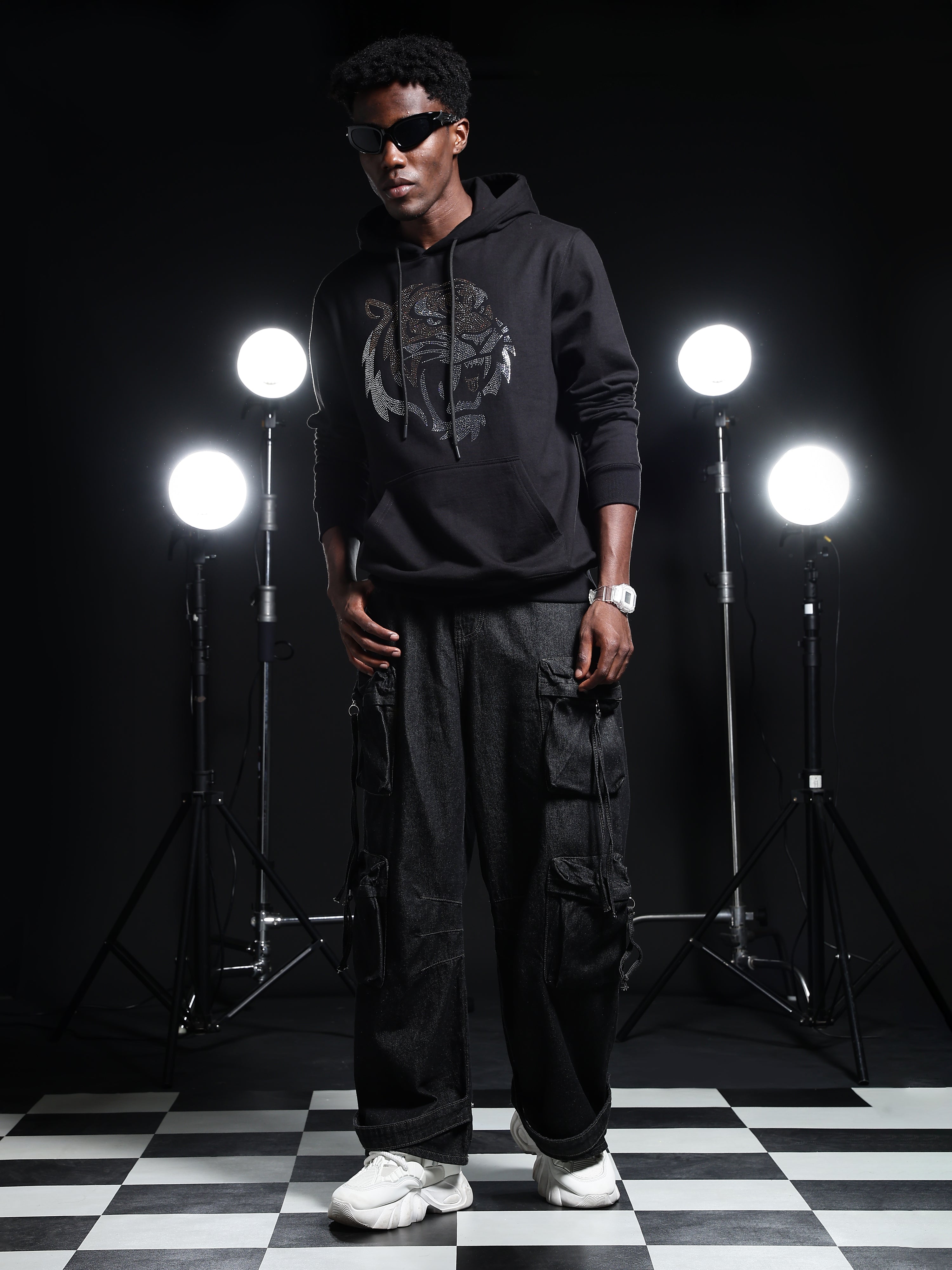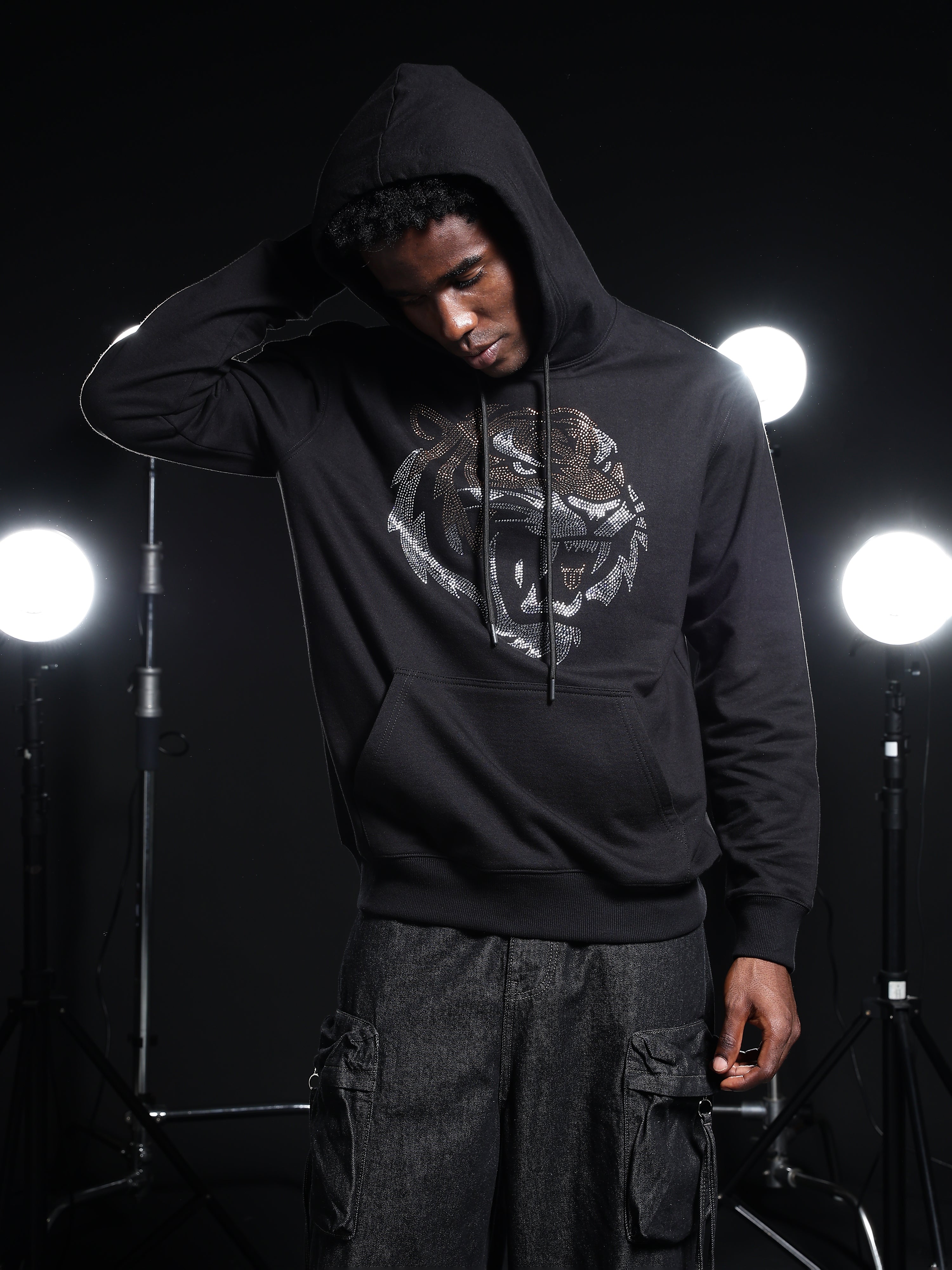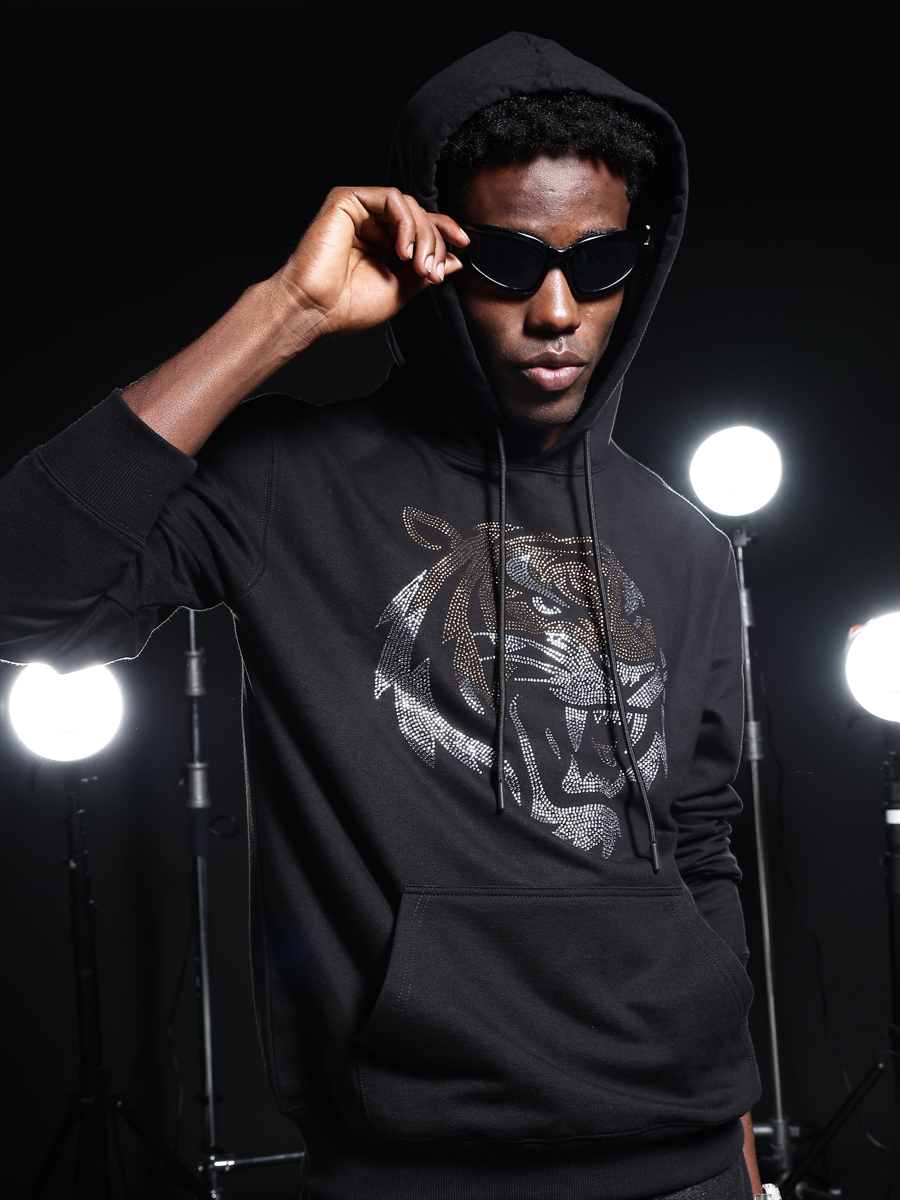 Go Devil Mens Black Rhine Stone Lion Graphic Hoodie