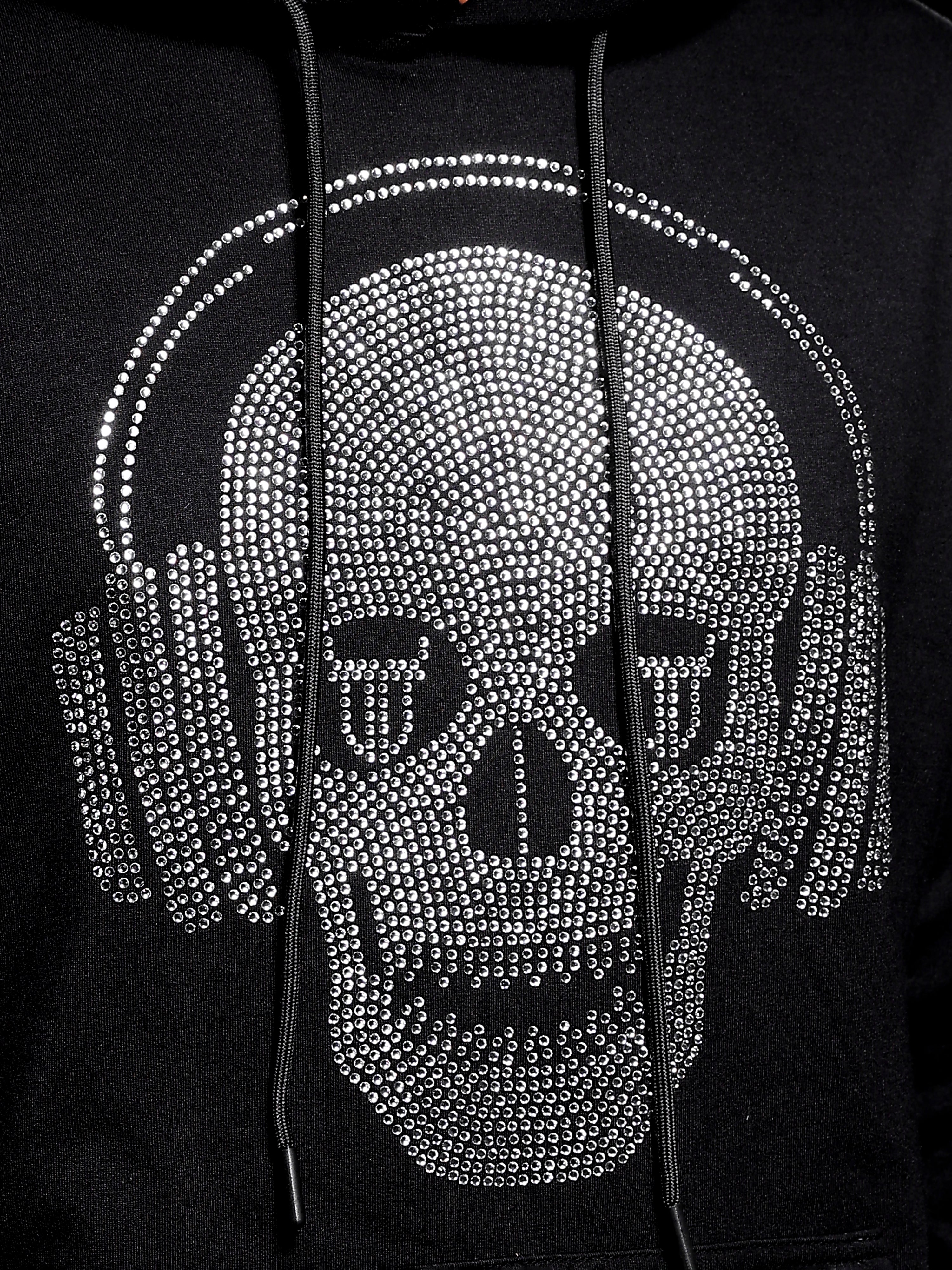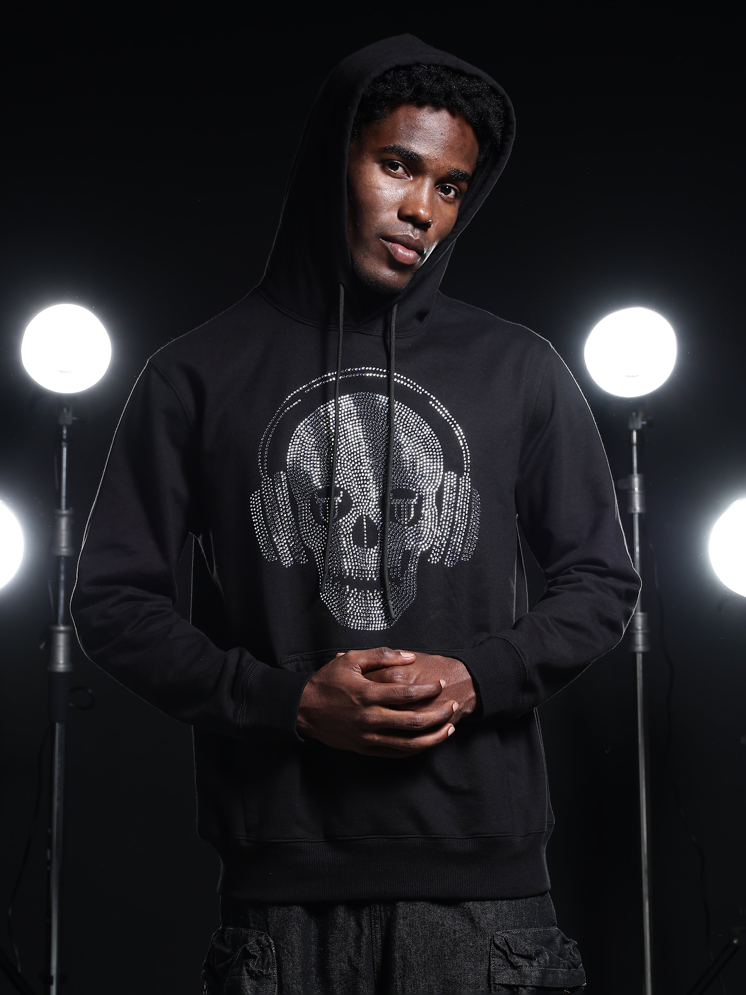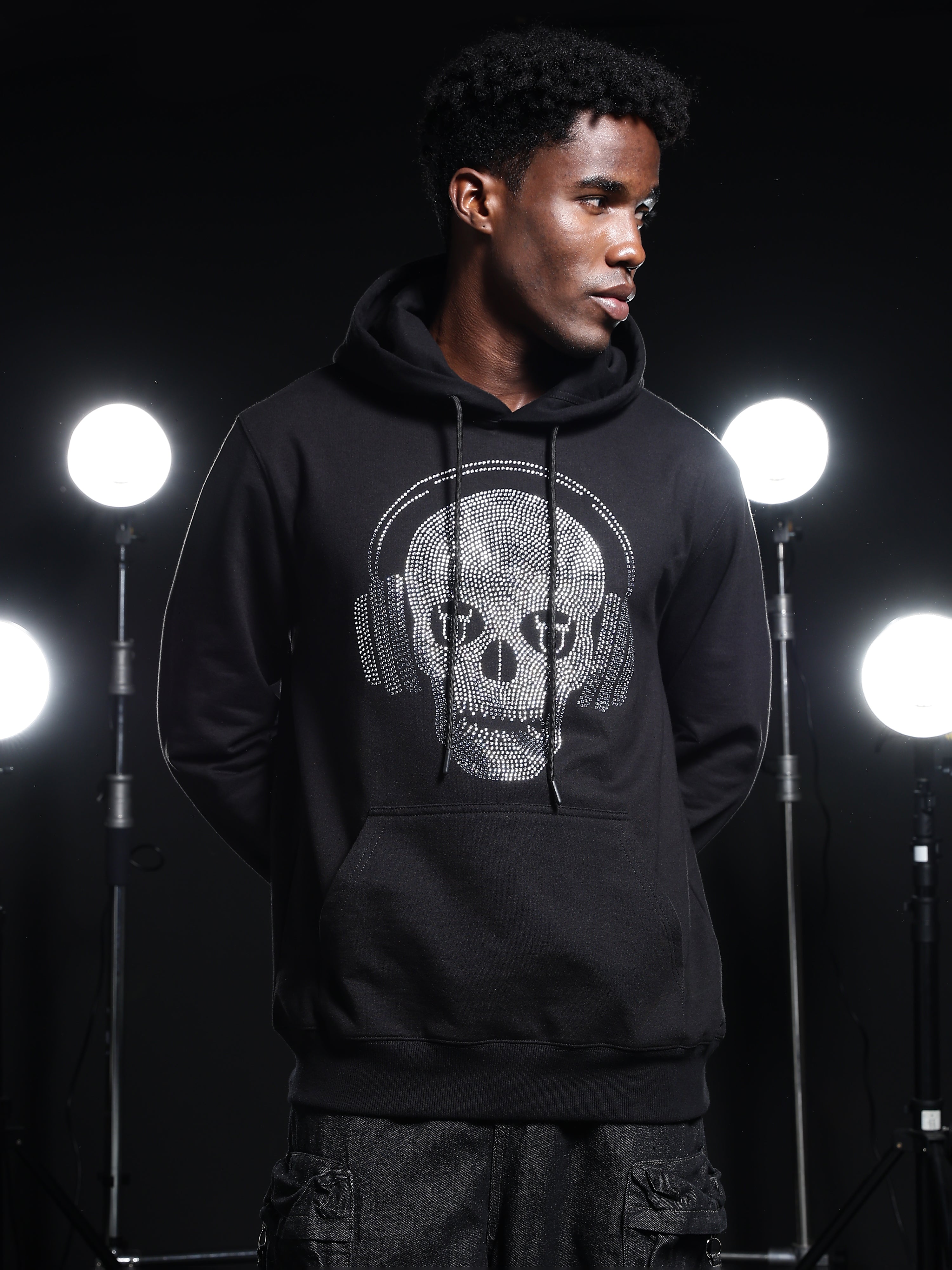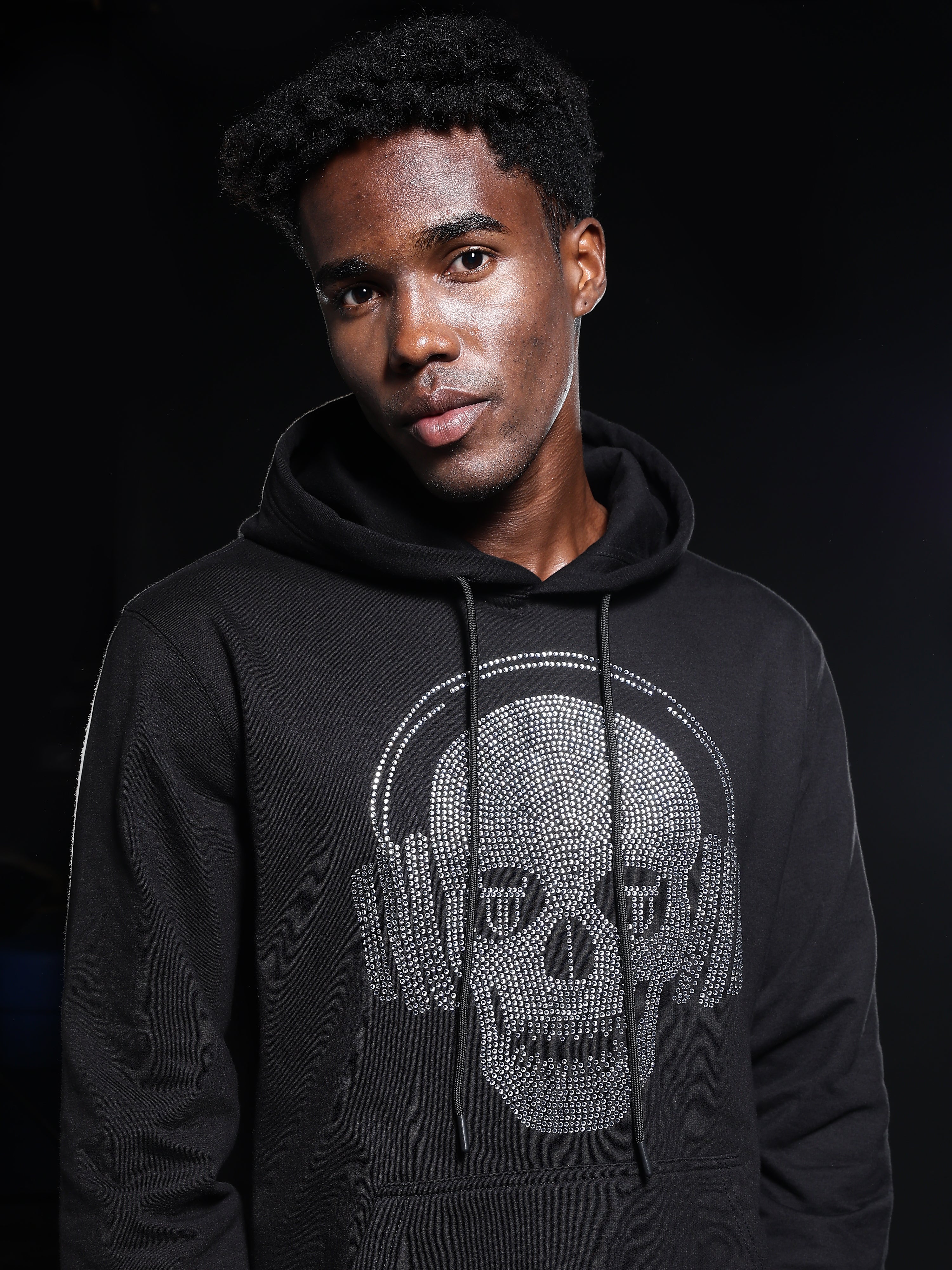 Go Devil Mens Black Rhine Stone Skull Headphone Graphic Hoodie