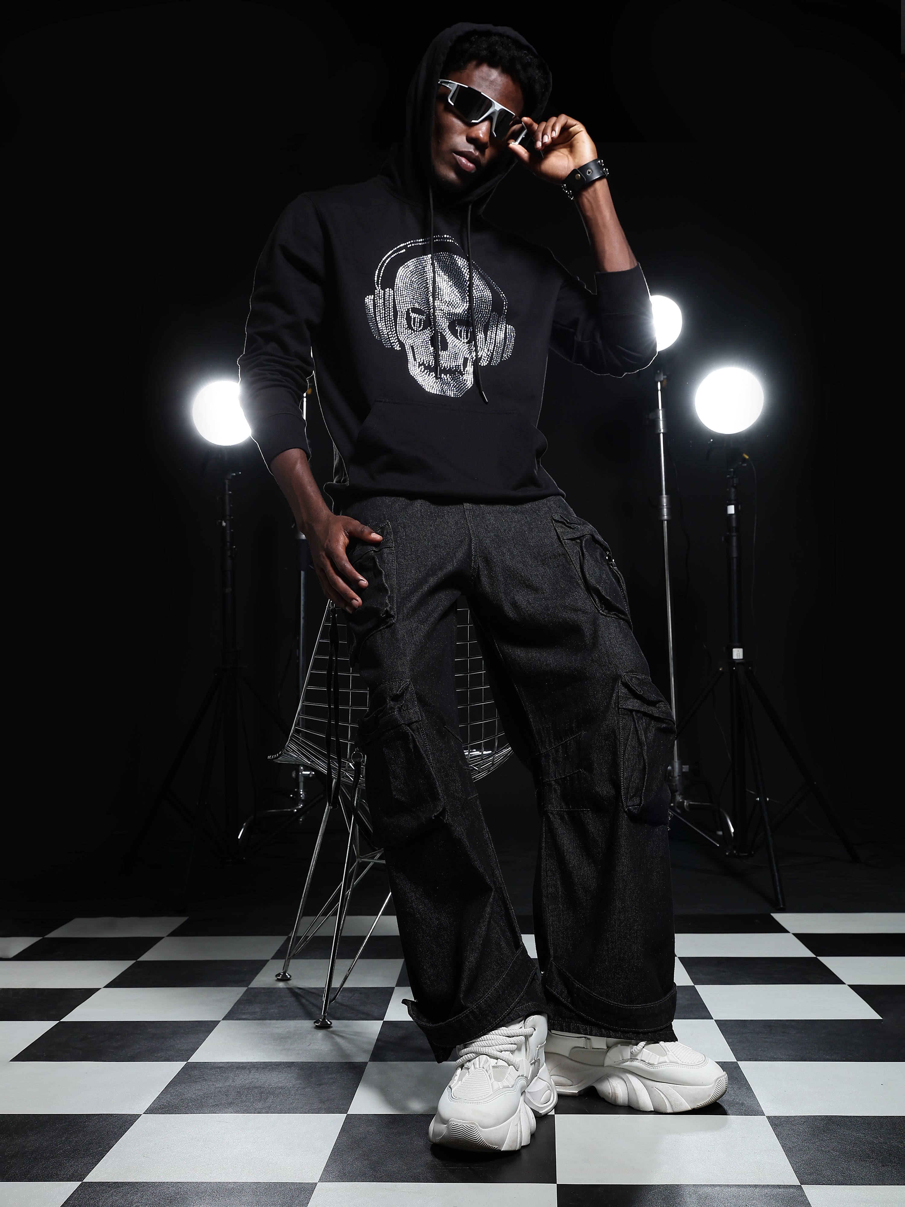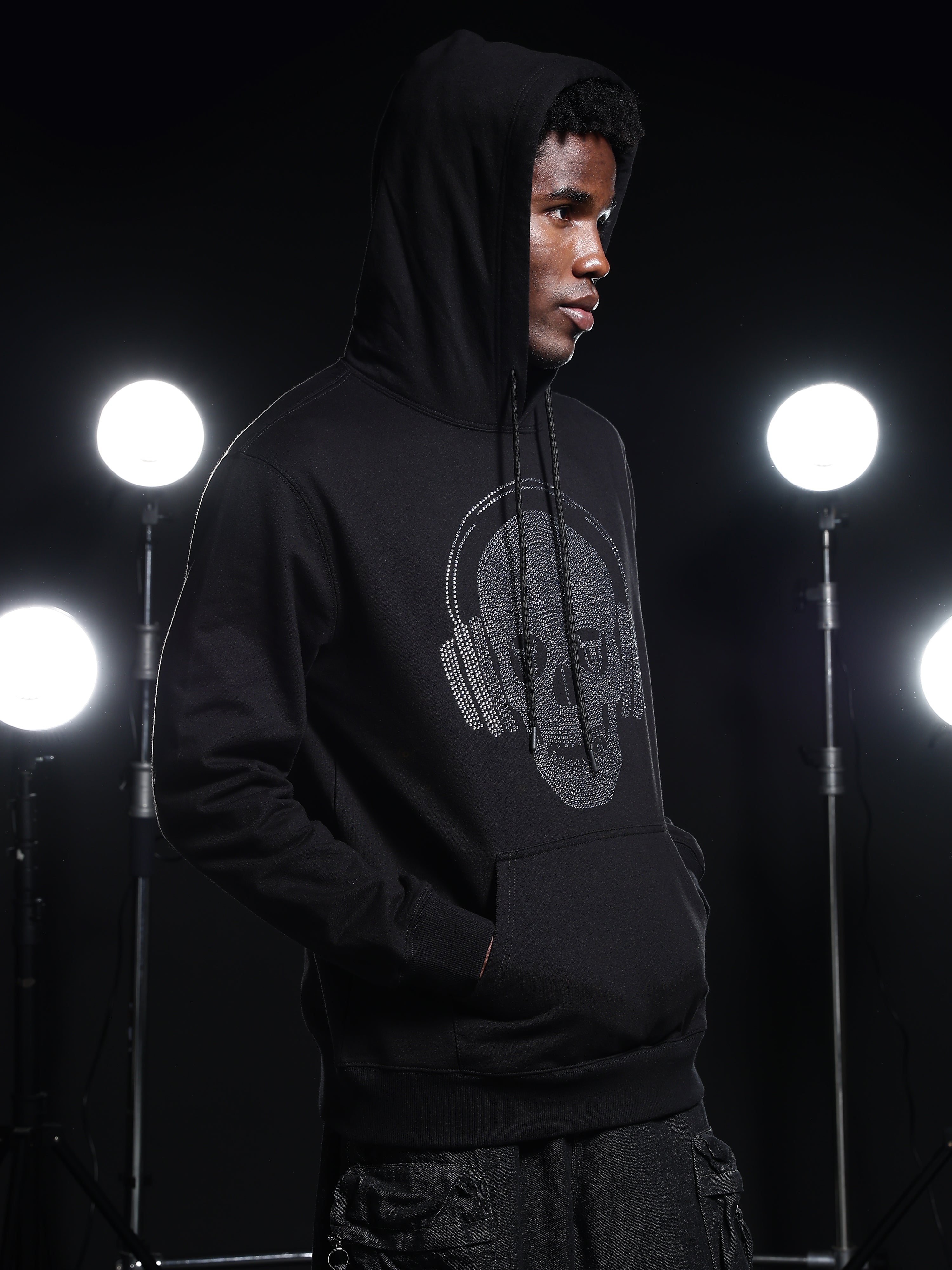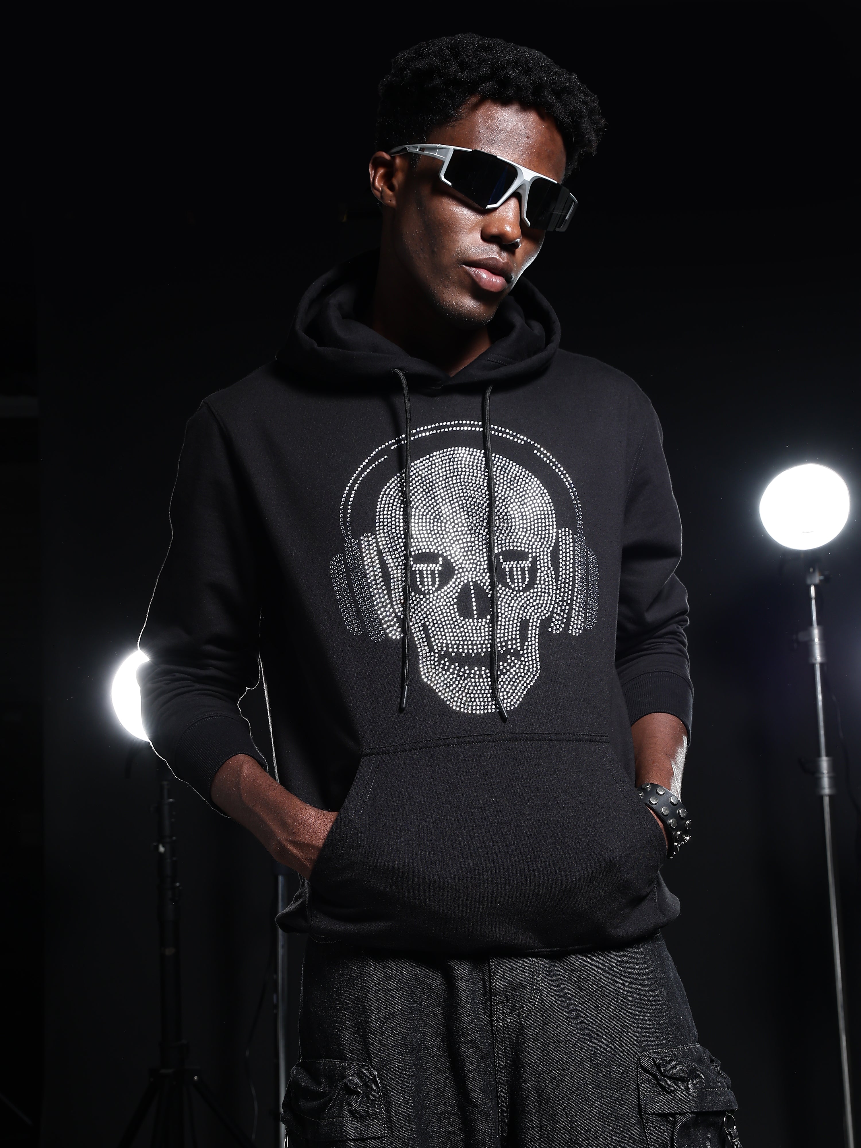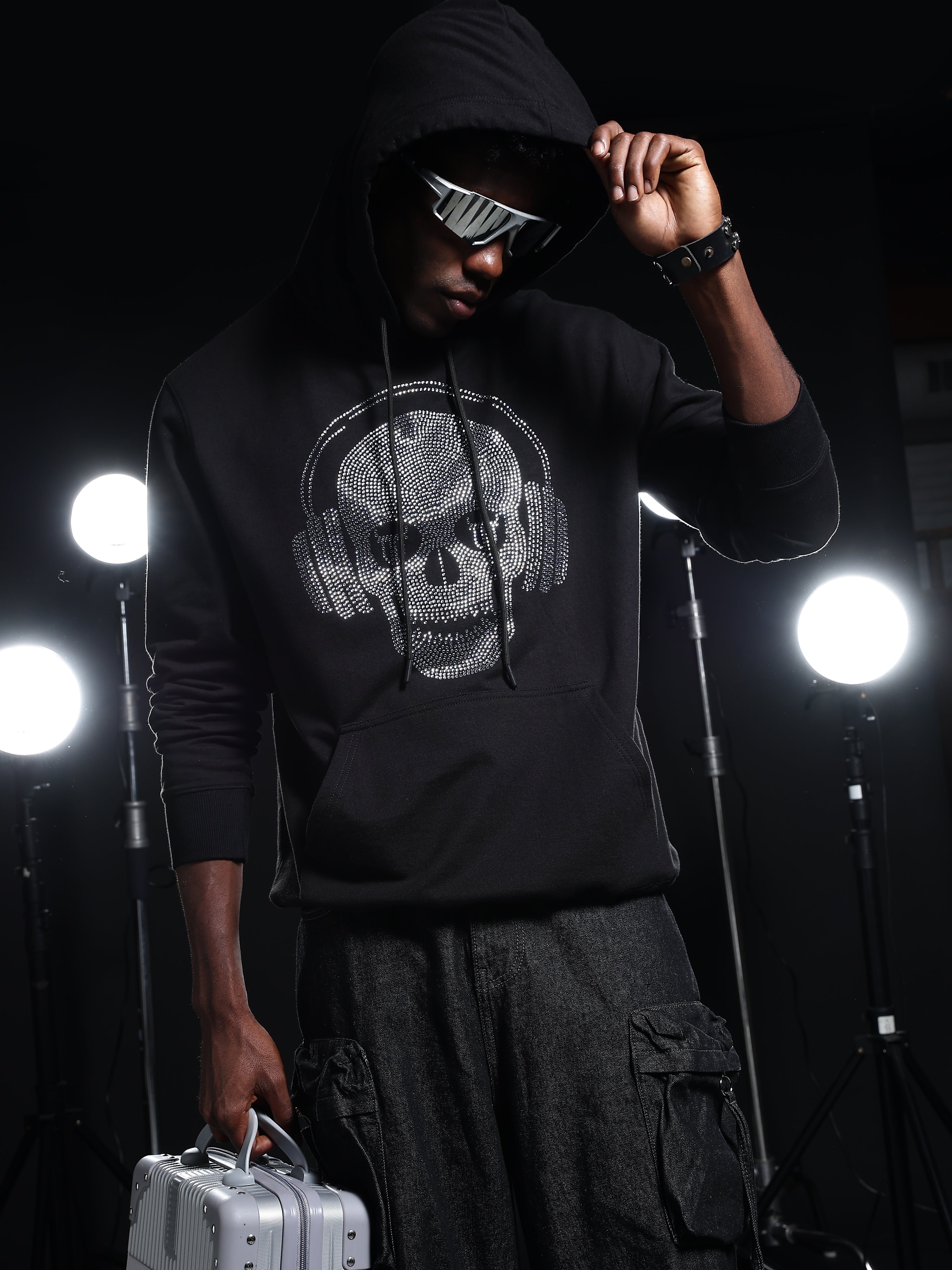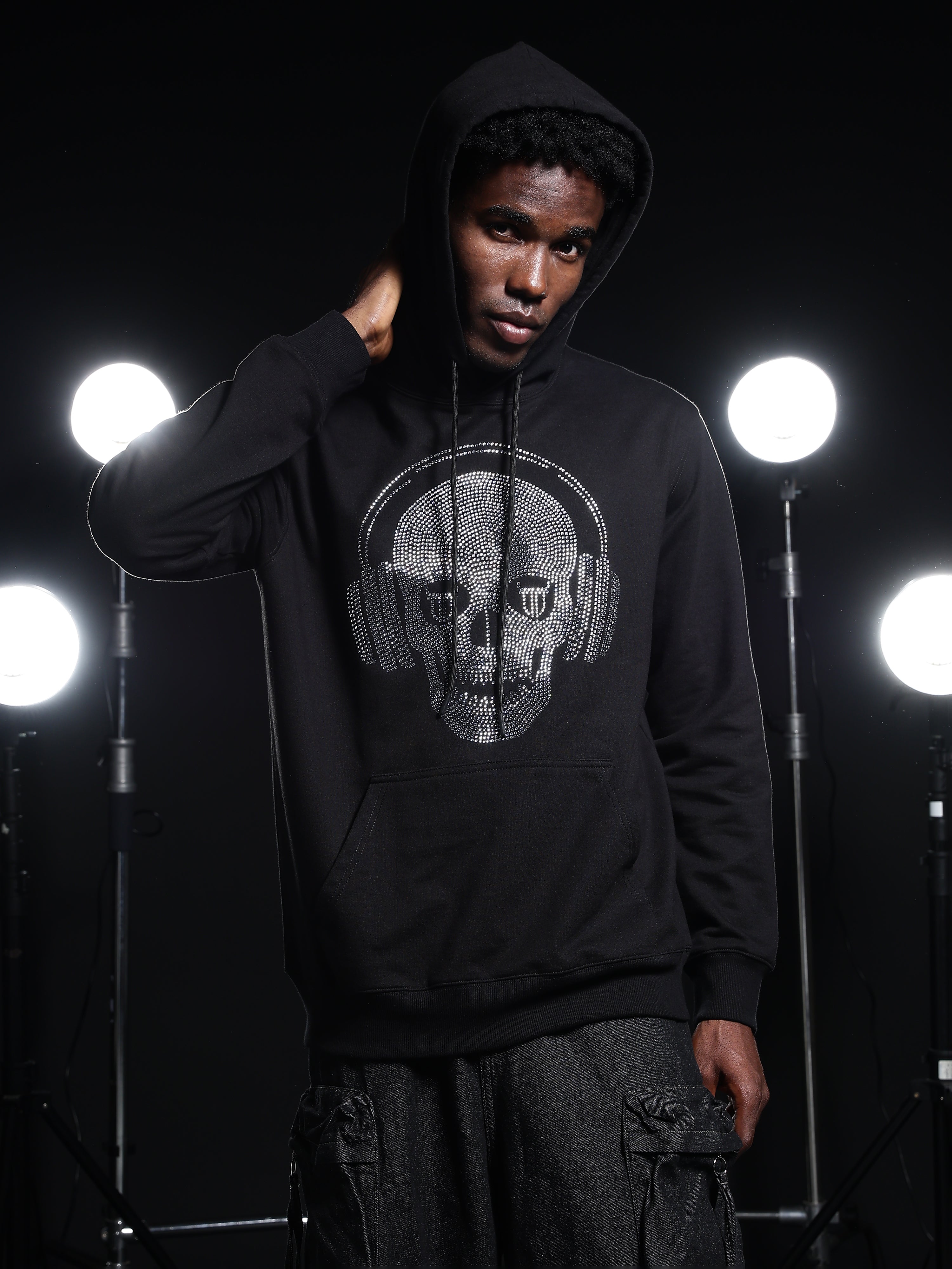 Go Devil Mens Black Rhine Stone Skull Headphone Graphic Hoodie