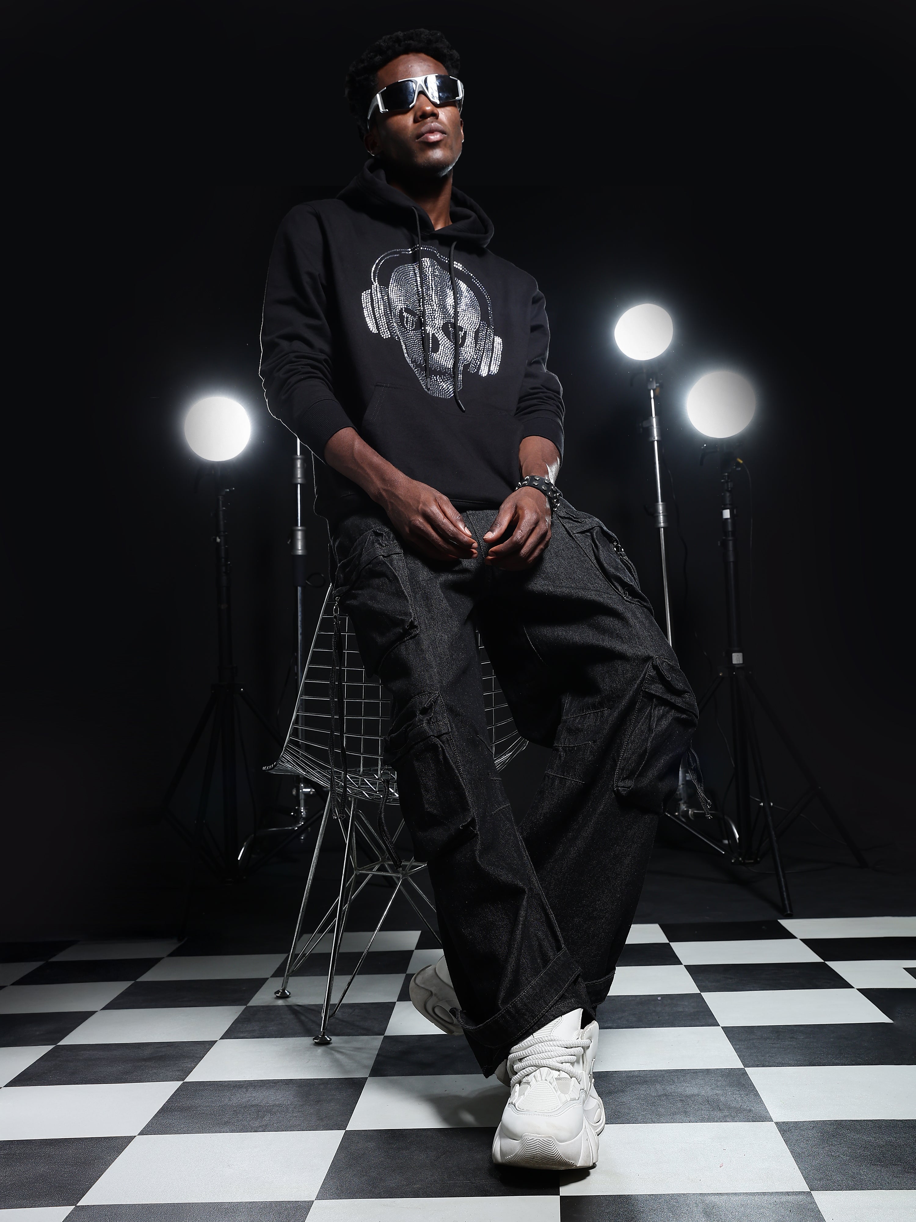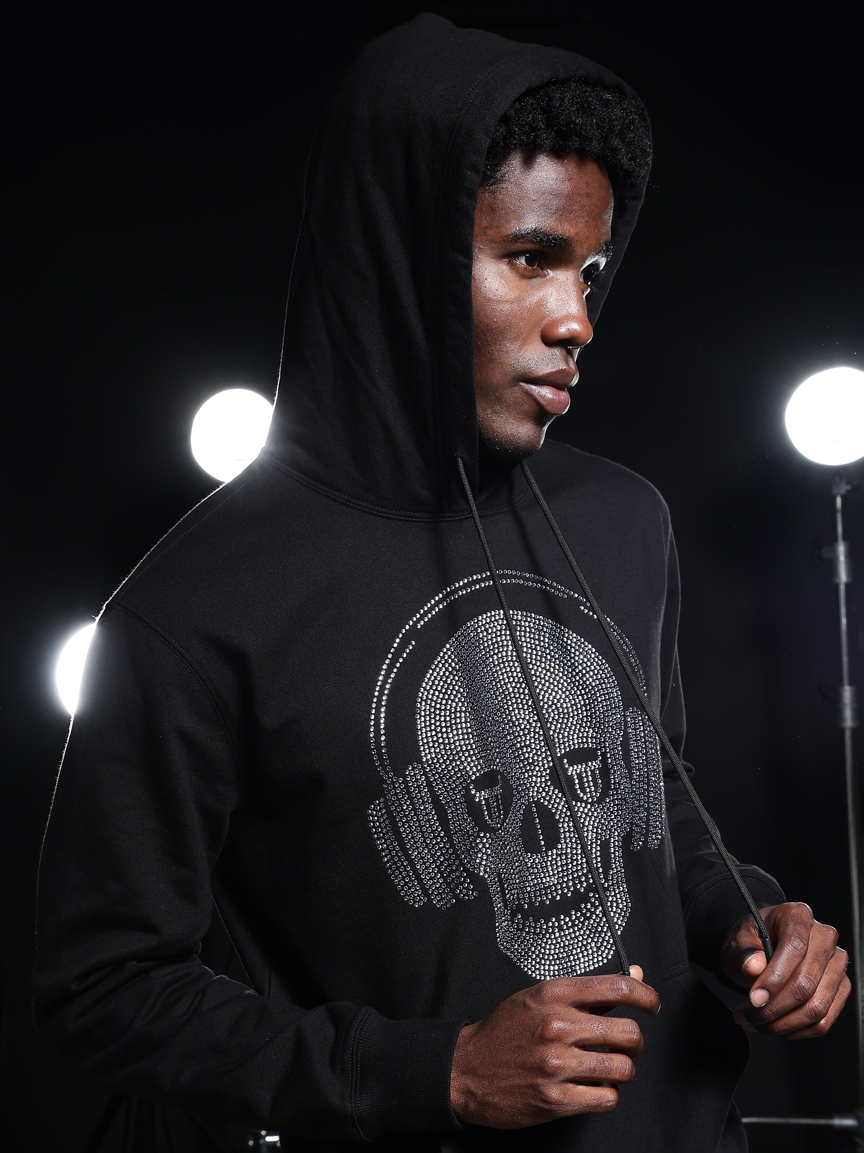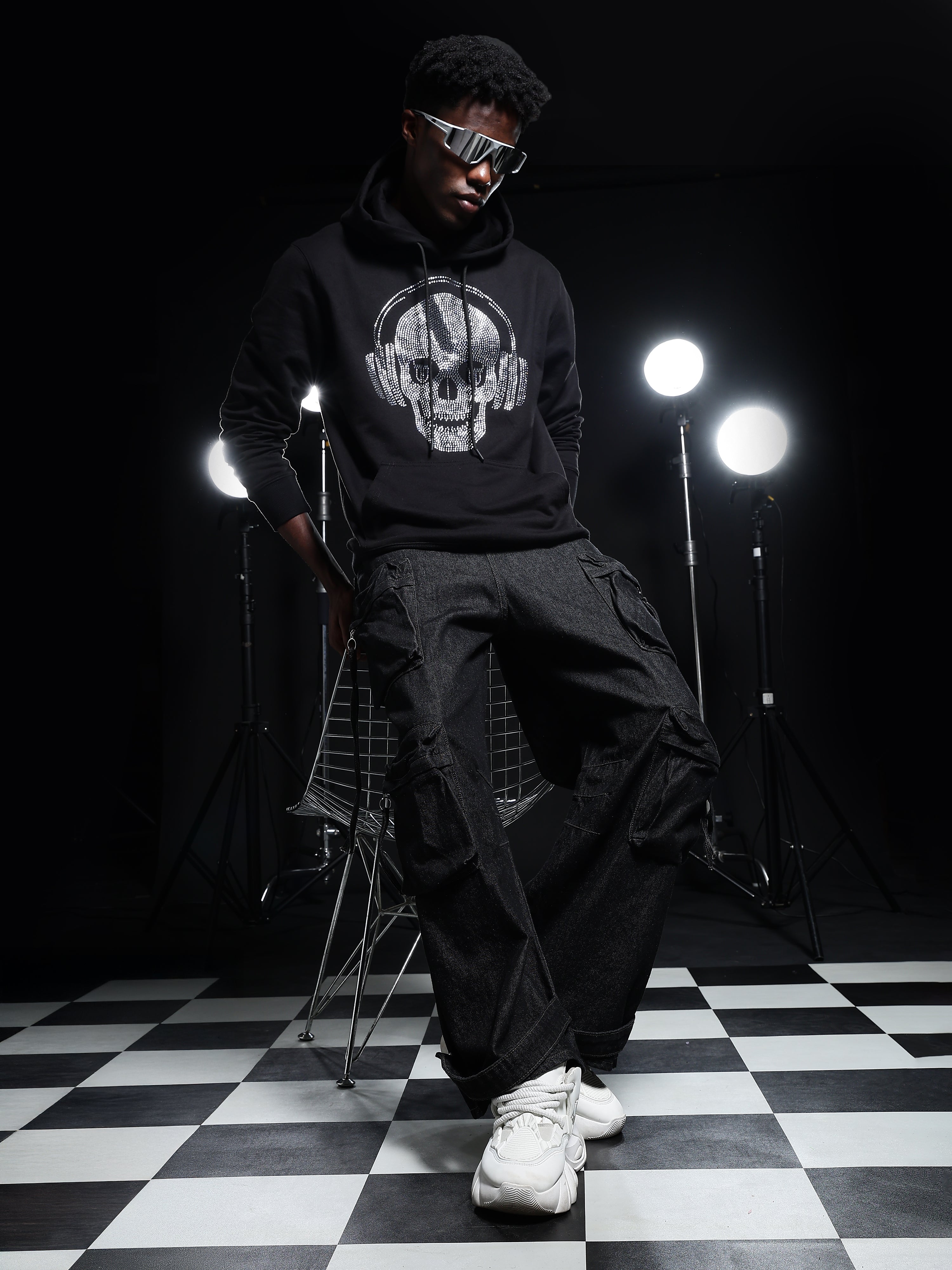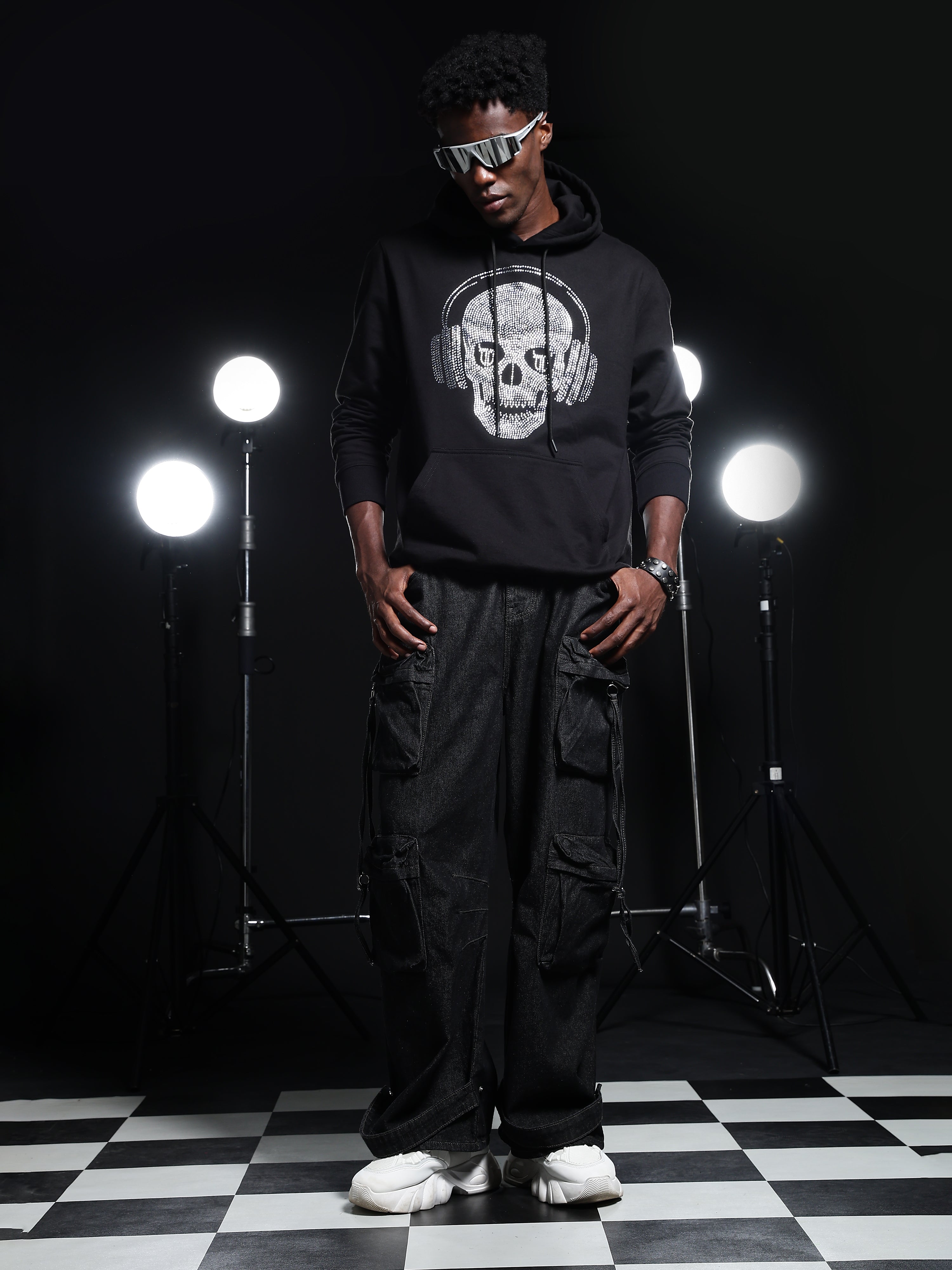 Go Devil Mens Black Rhine Stone Skull Headphone Graphic Hoodie