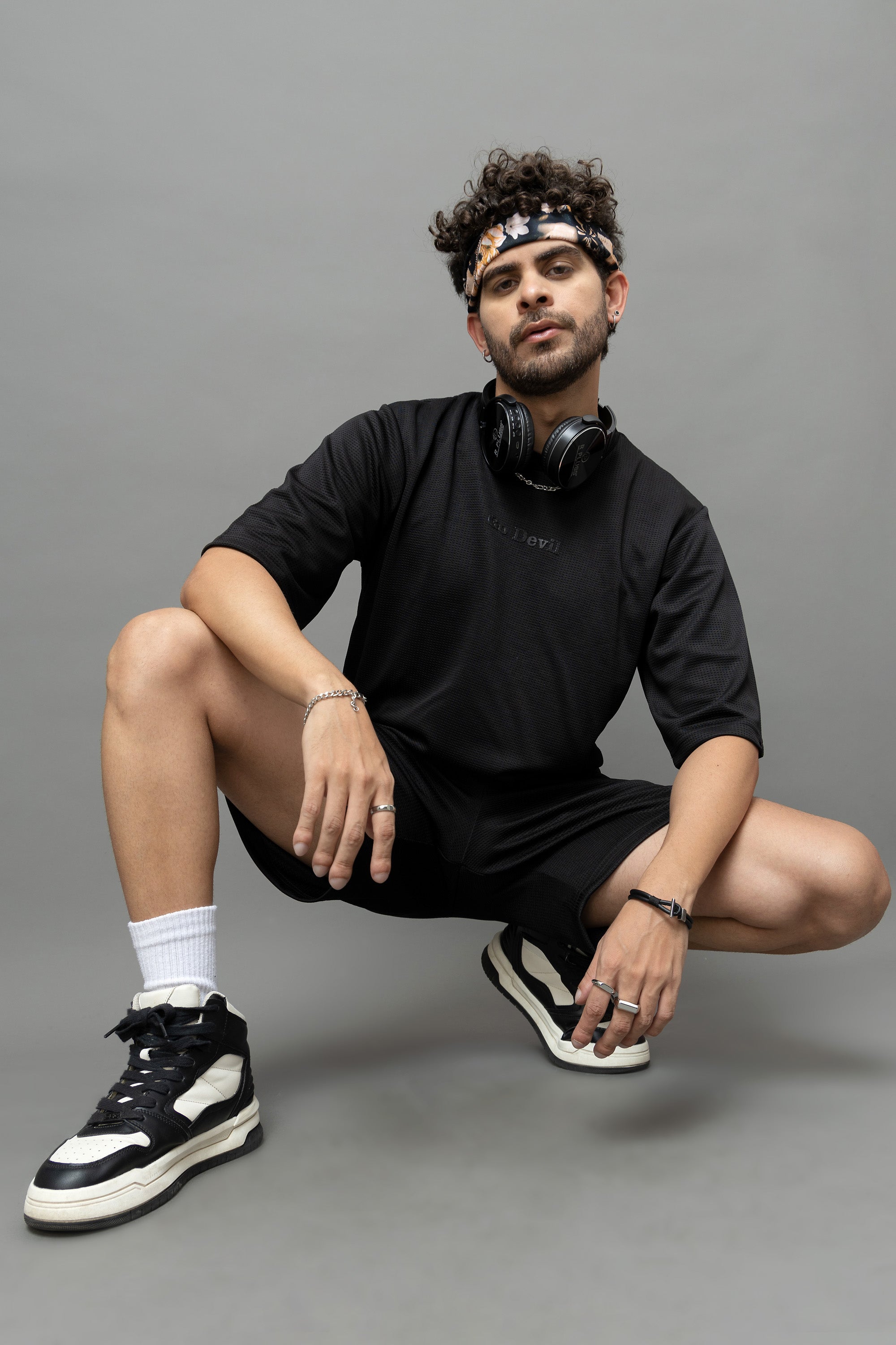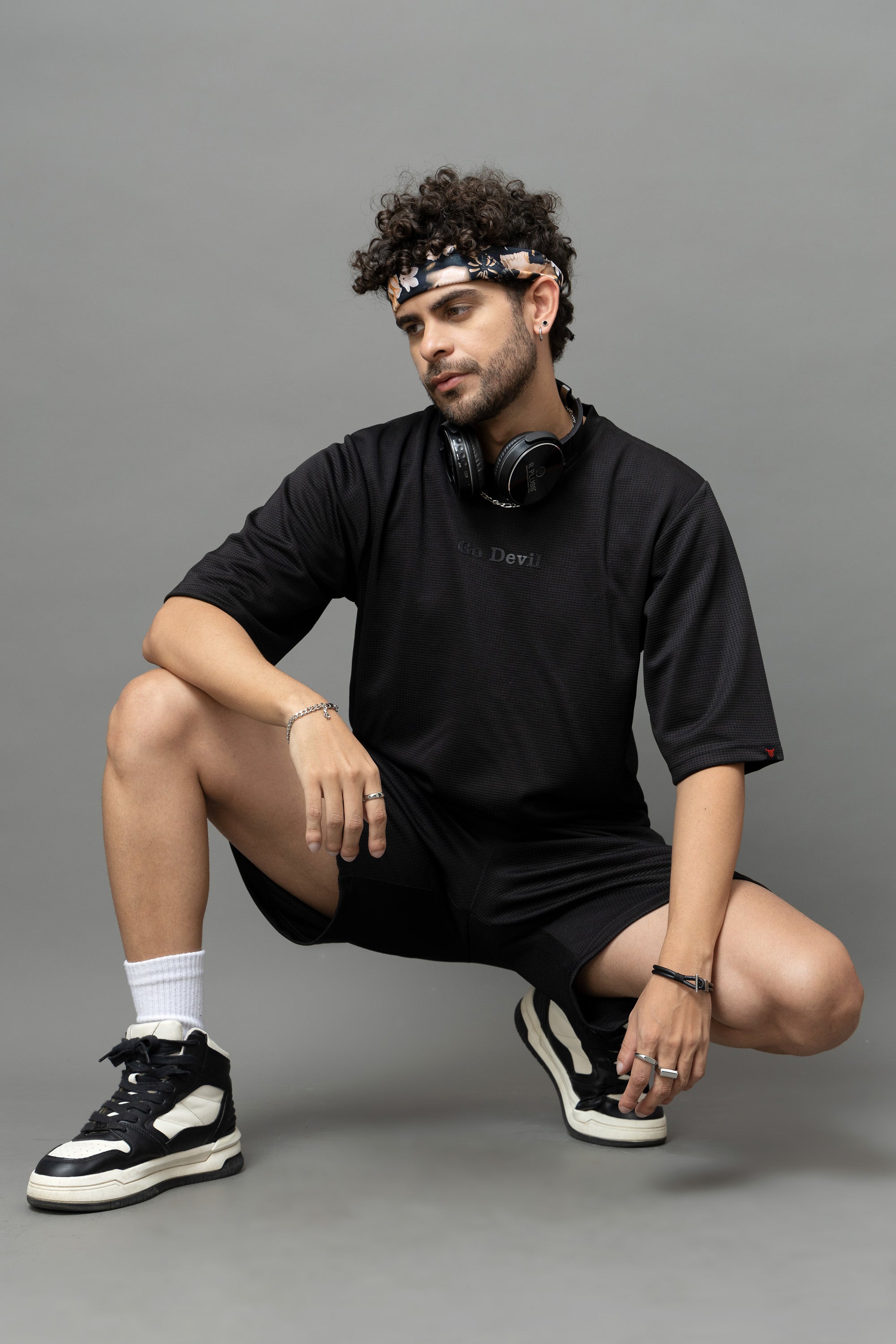 Chinese Devil in Red Foil Print Black Oversized T-Shirt for Men
