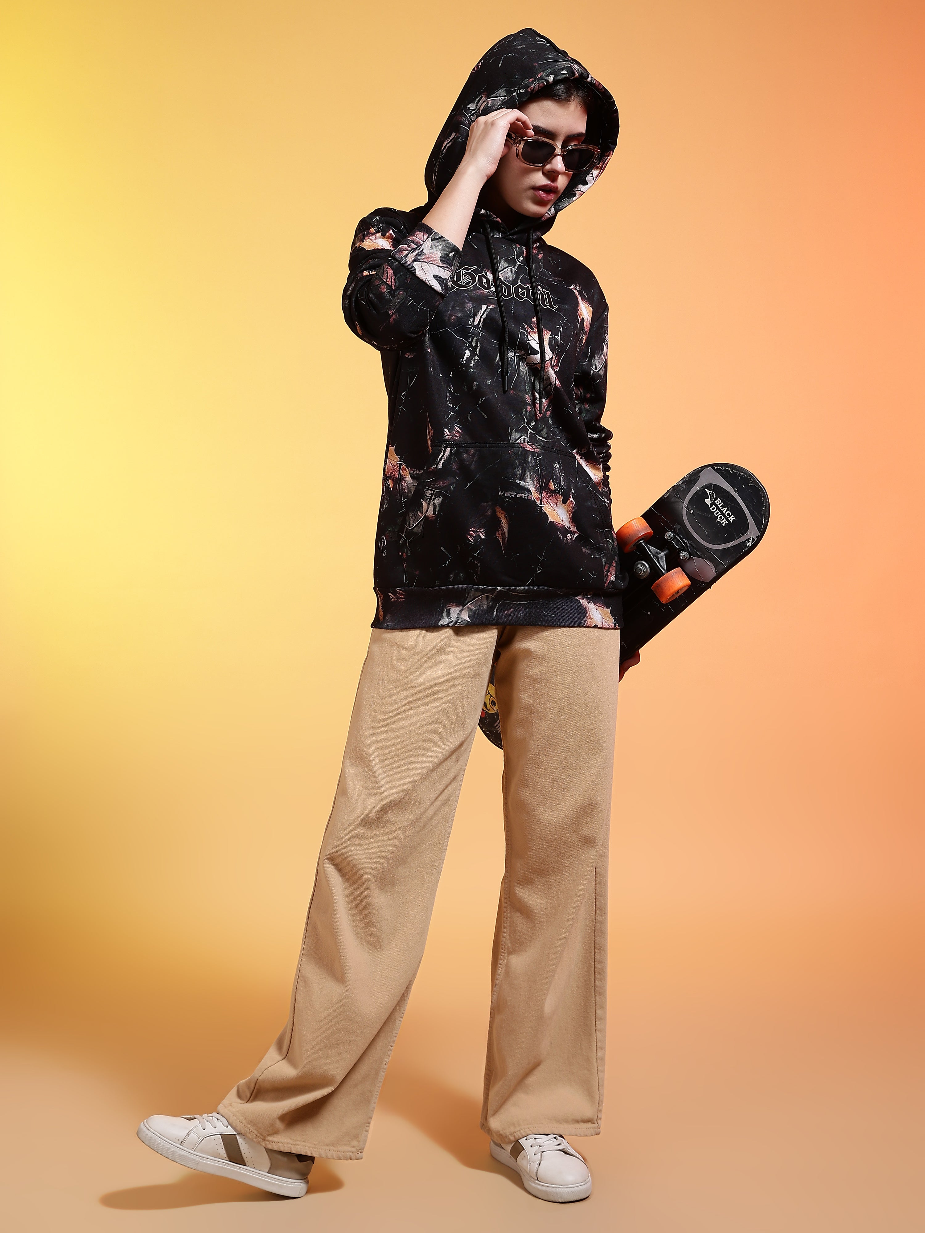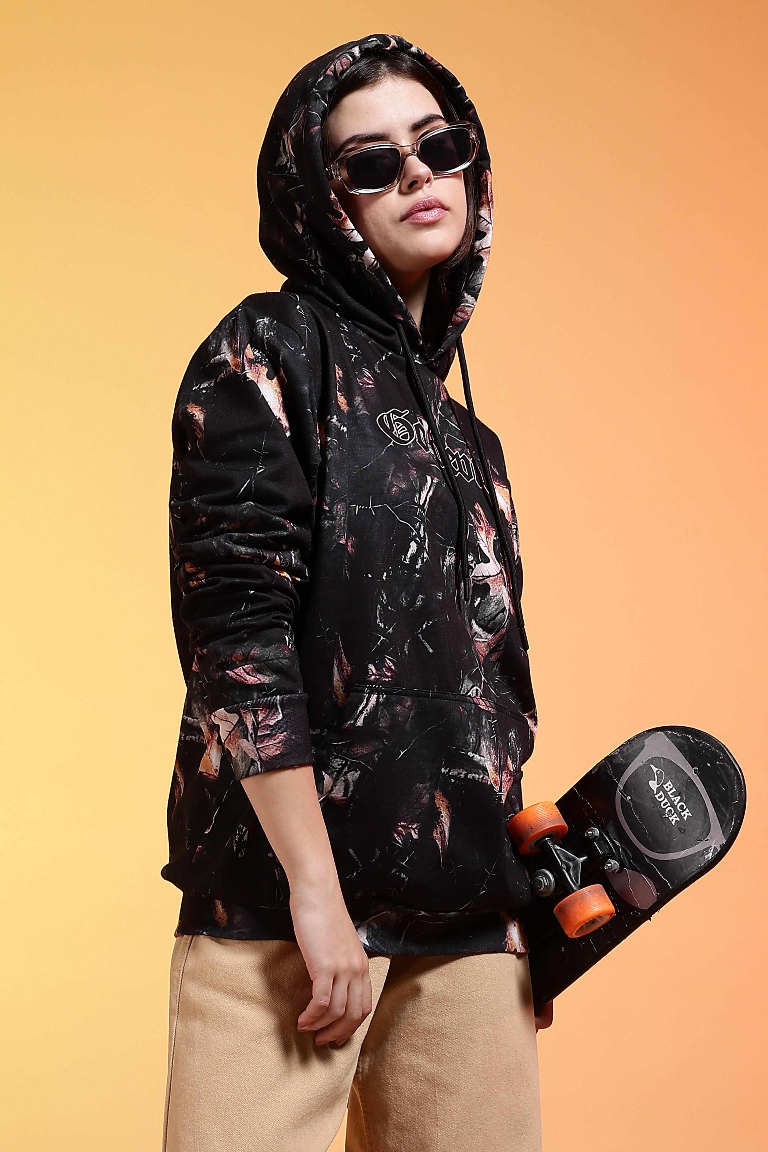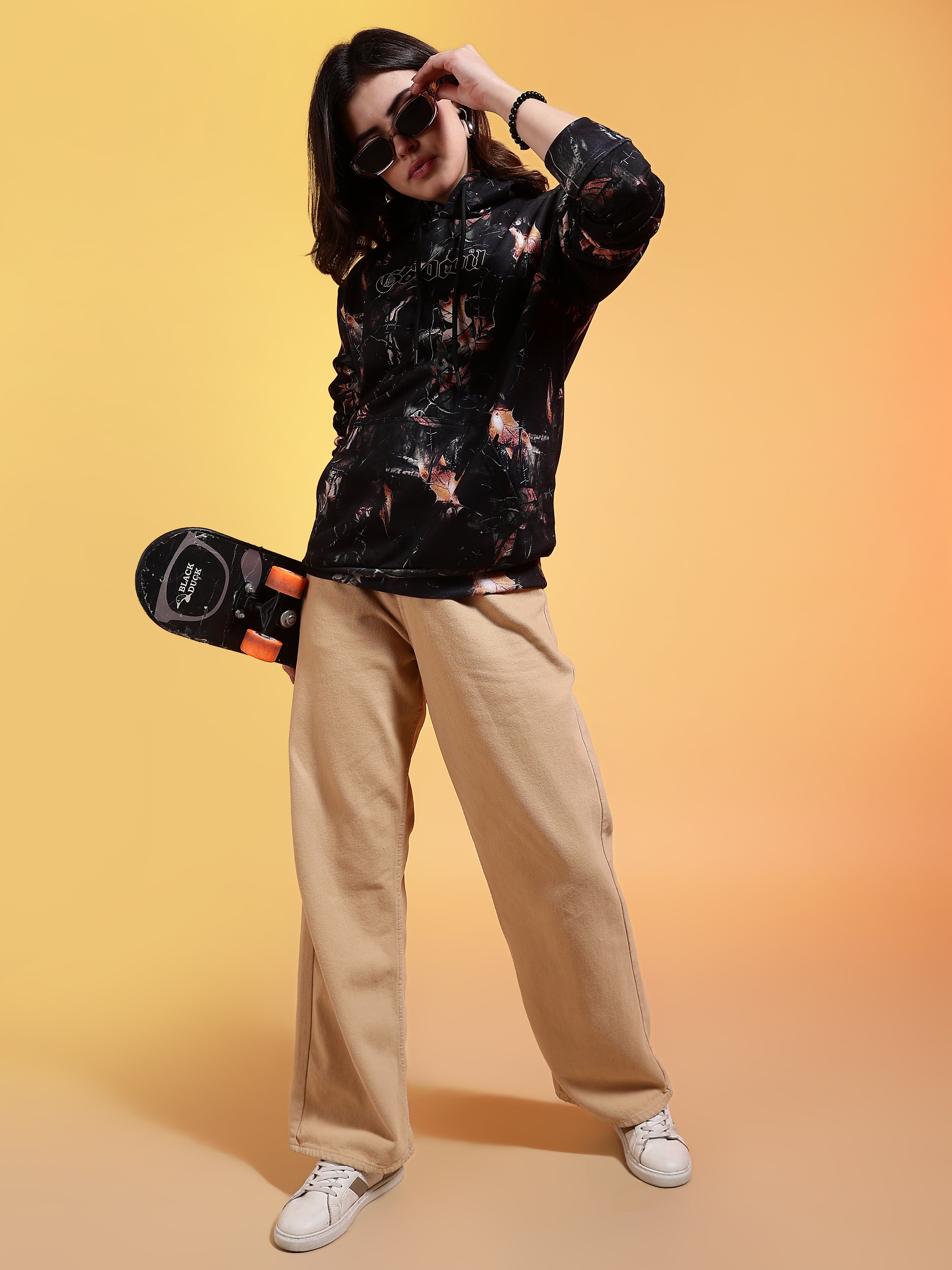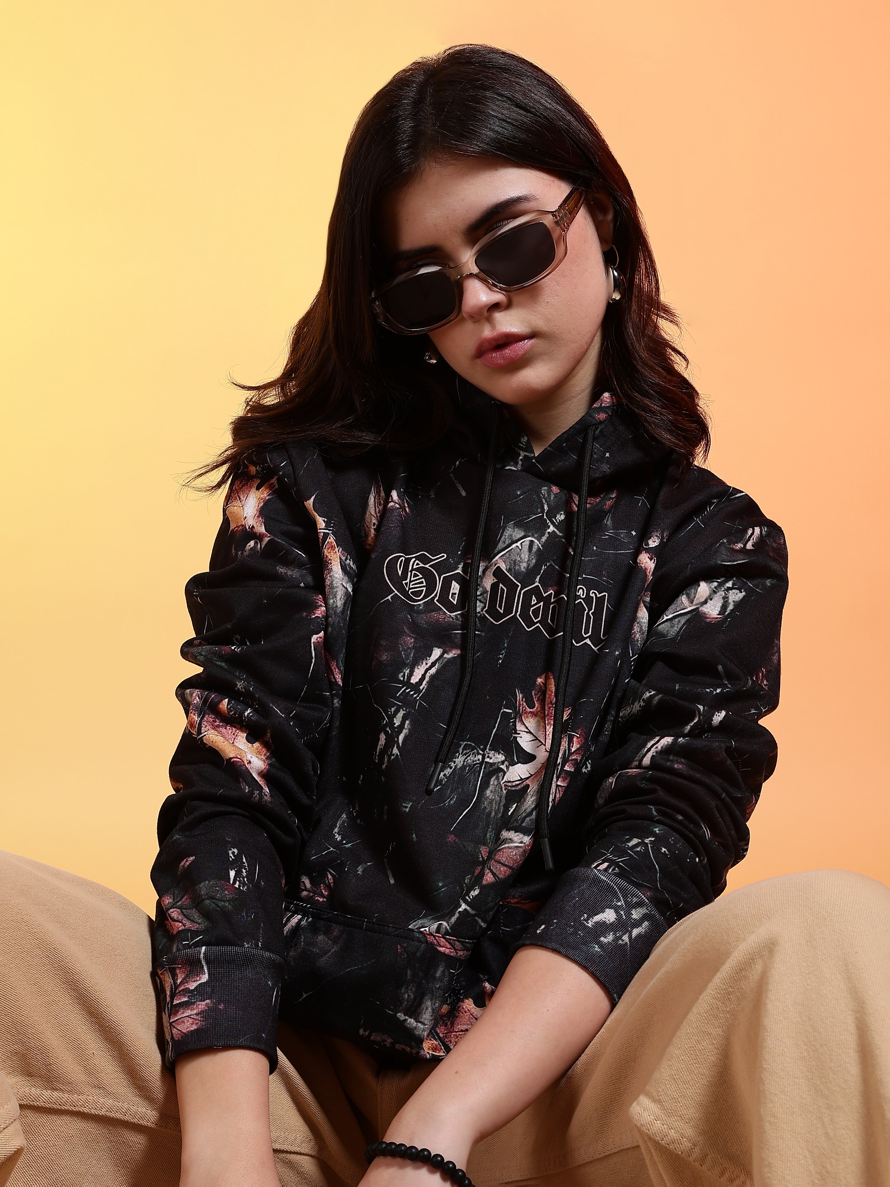 Go Devil Printed Black Womens Leaf Print Hoodie