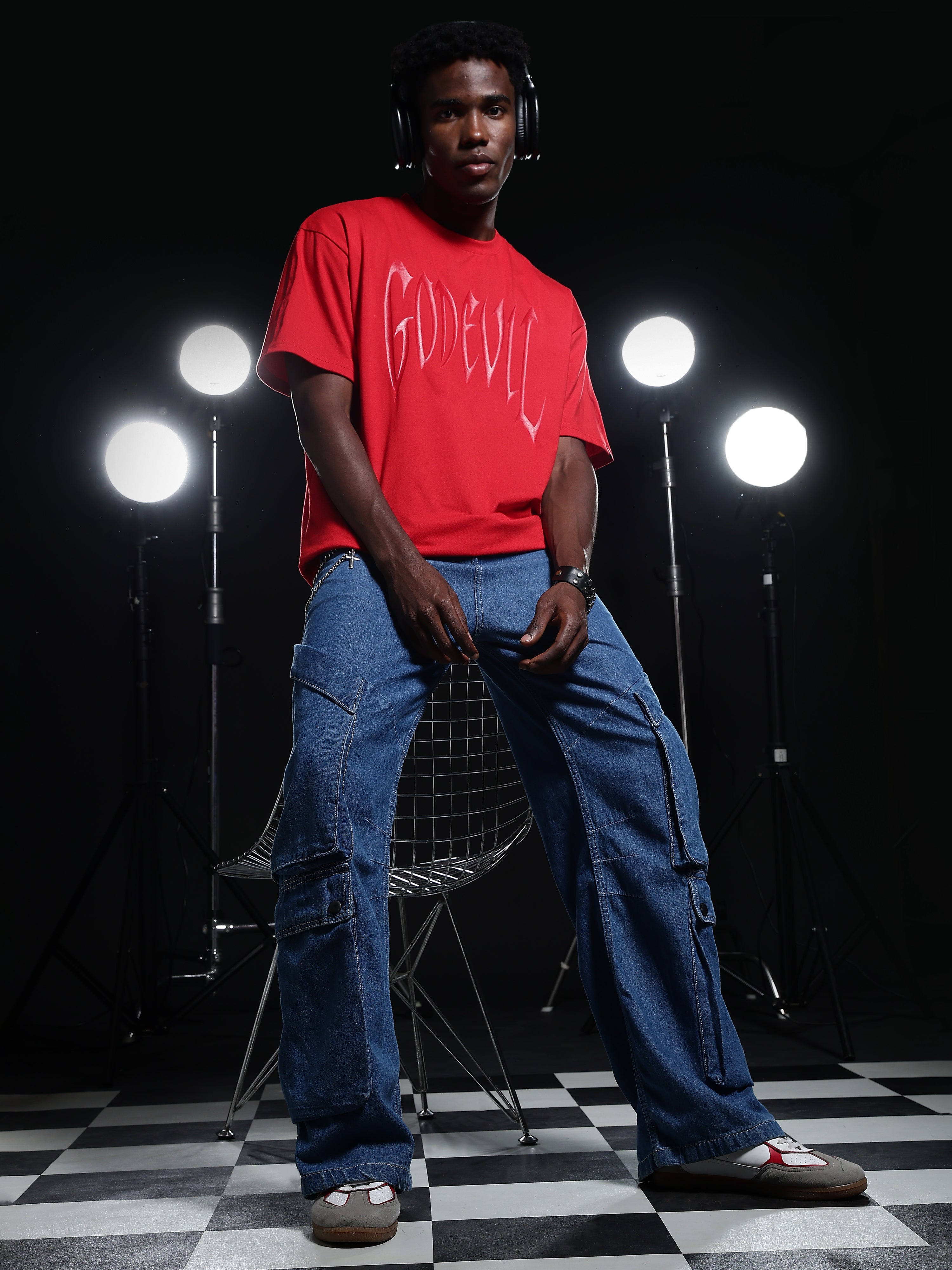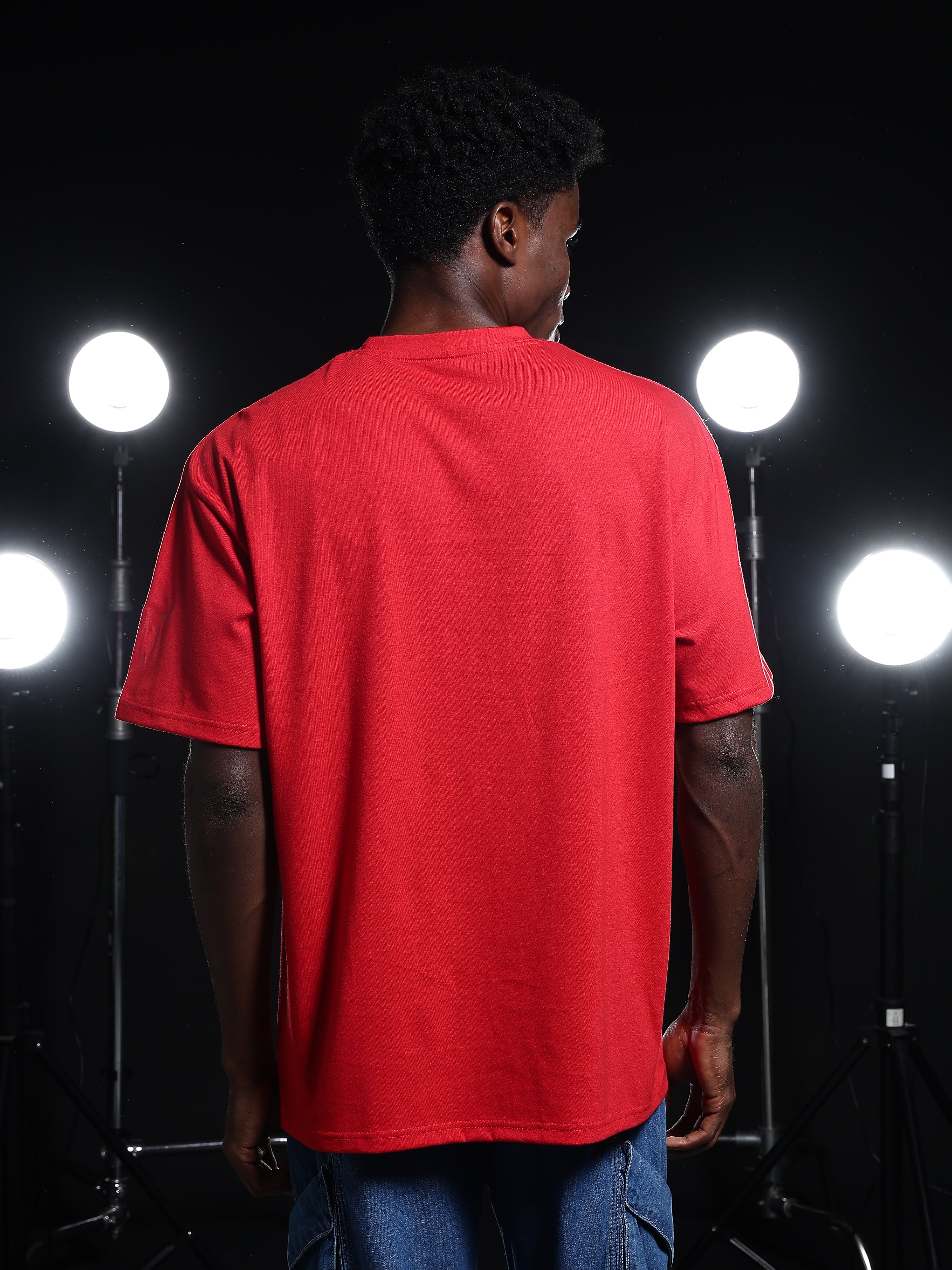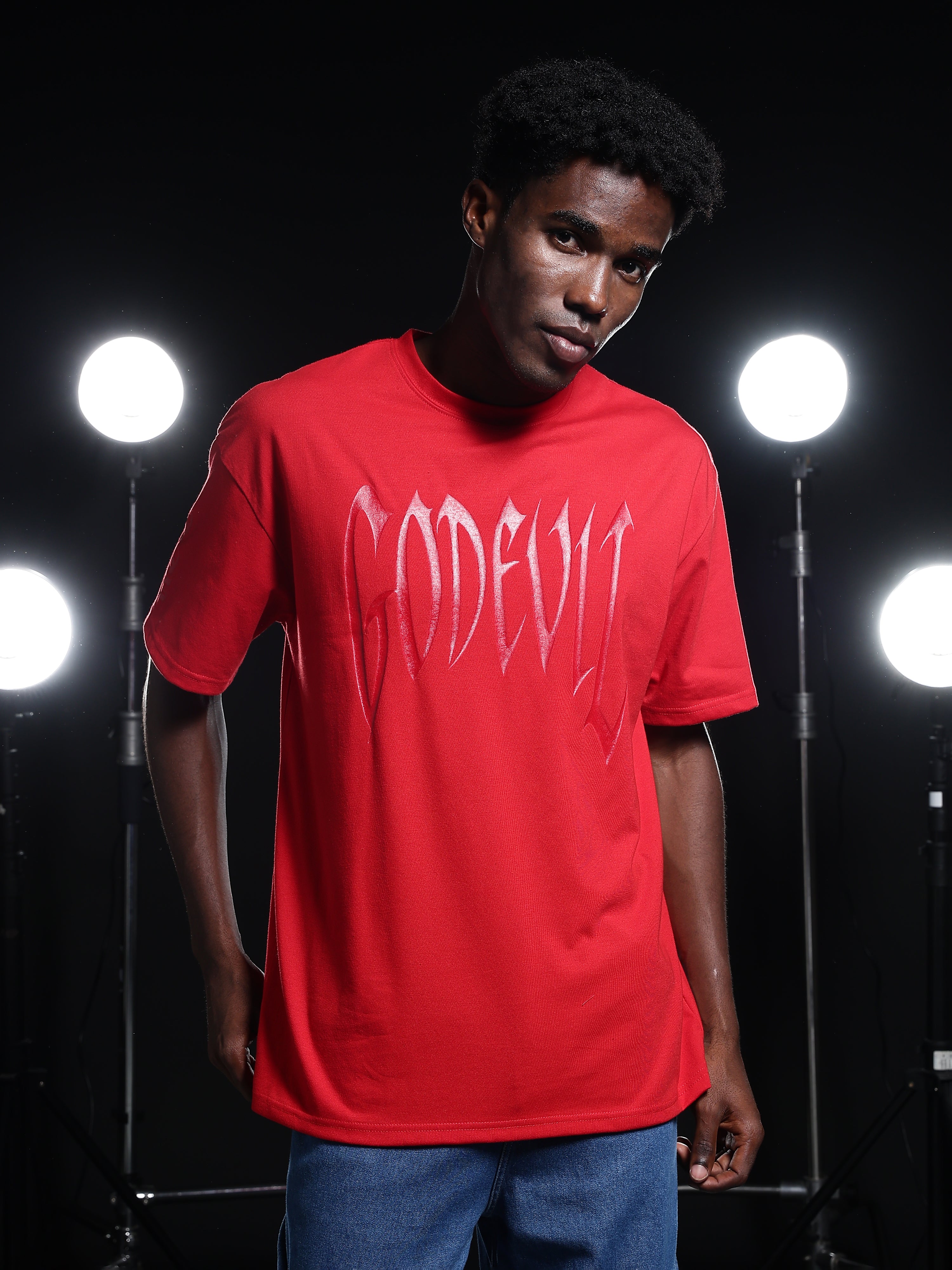 Chinese Devil in Red Foil Print Black Oversized T-Shirt for Men