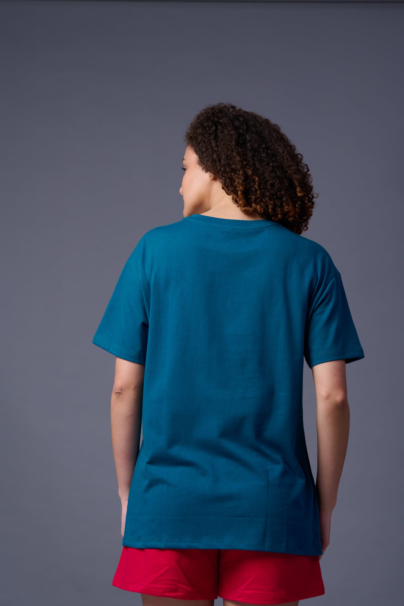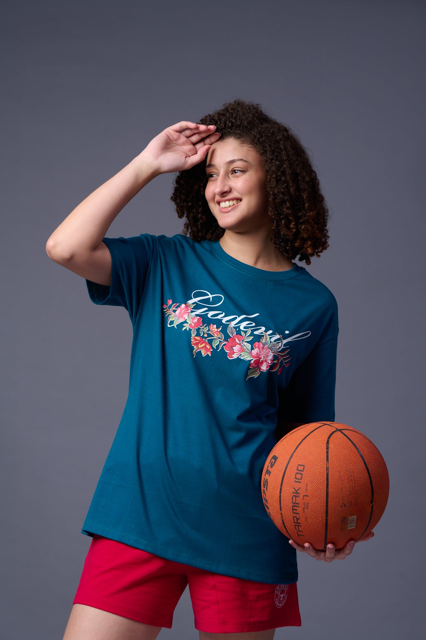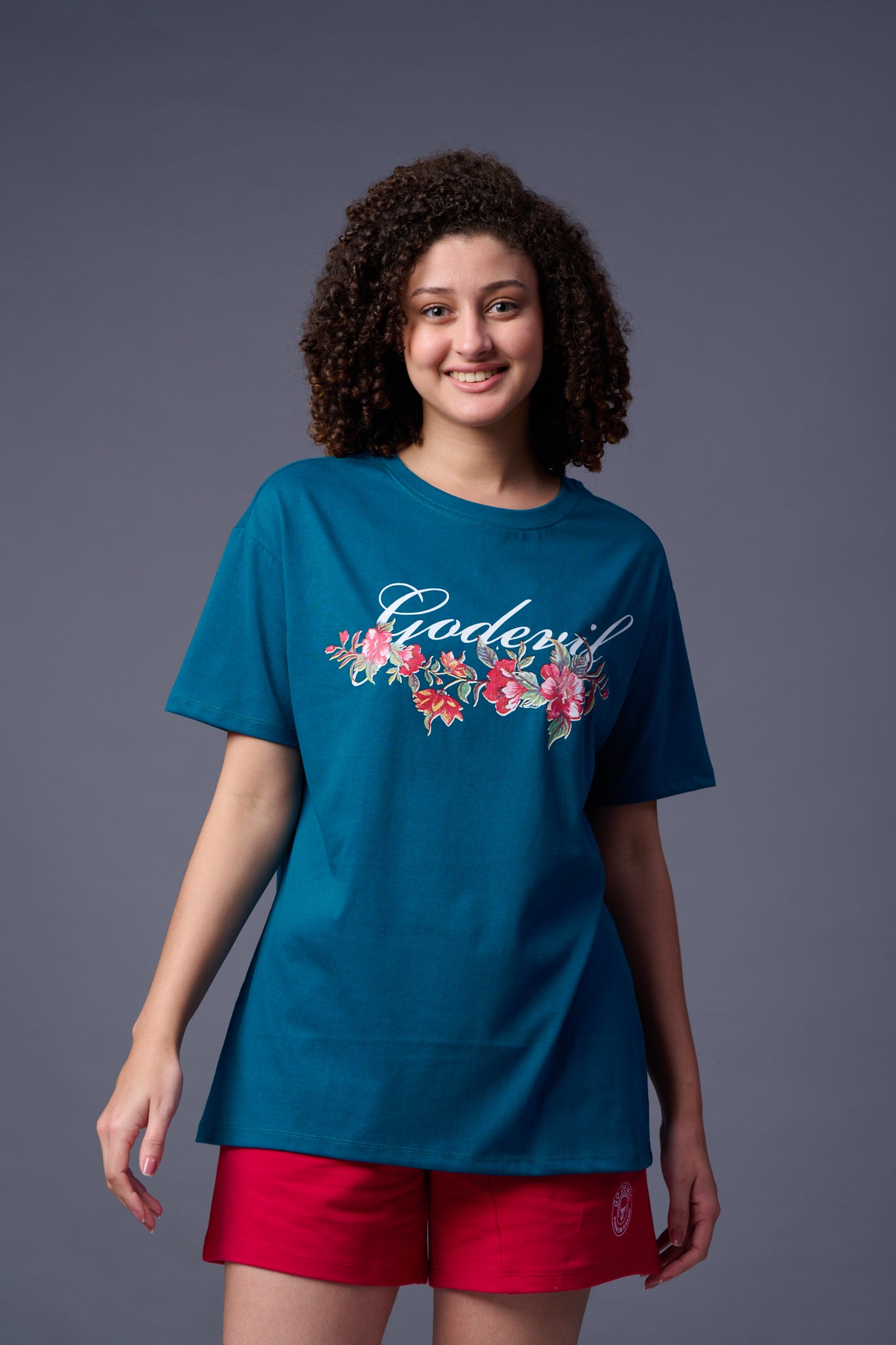 Go devil With Flower Printed Royal Blue Oversized T-Shirt for Women