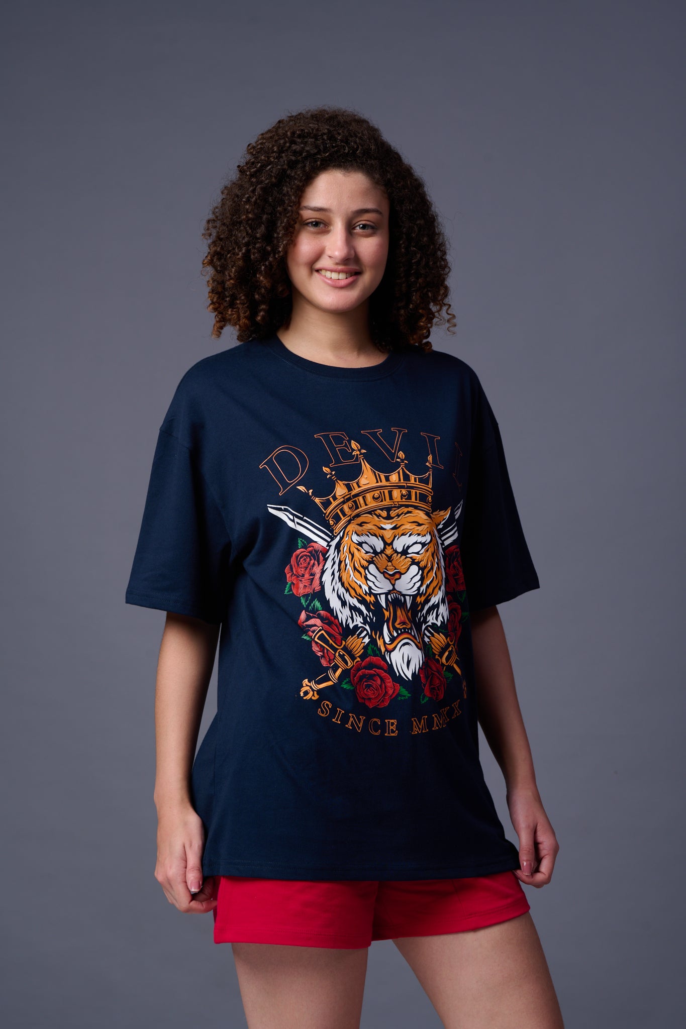 King Tiger Printed Navy Blue Oversized T-Shirt for Women