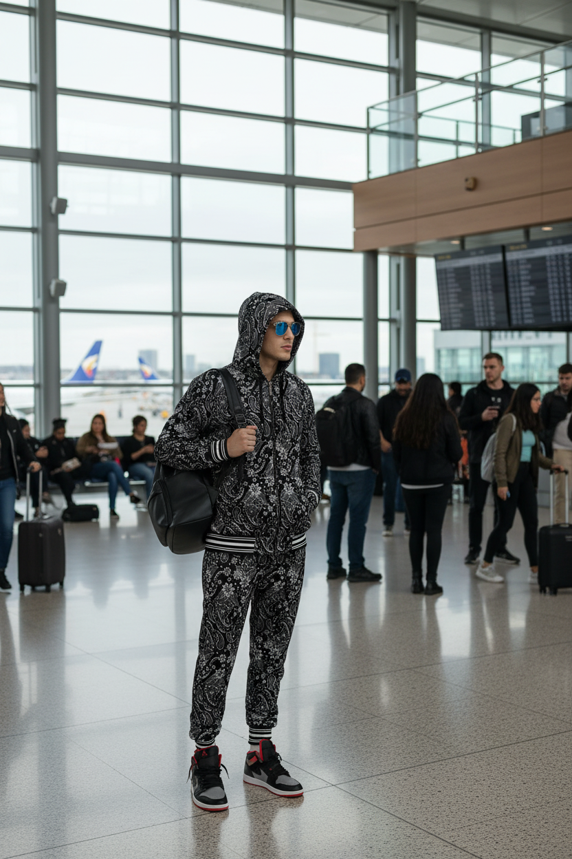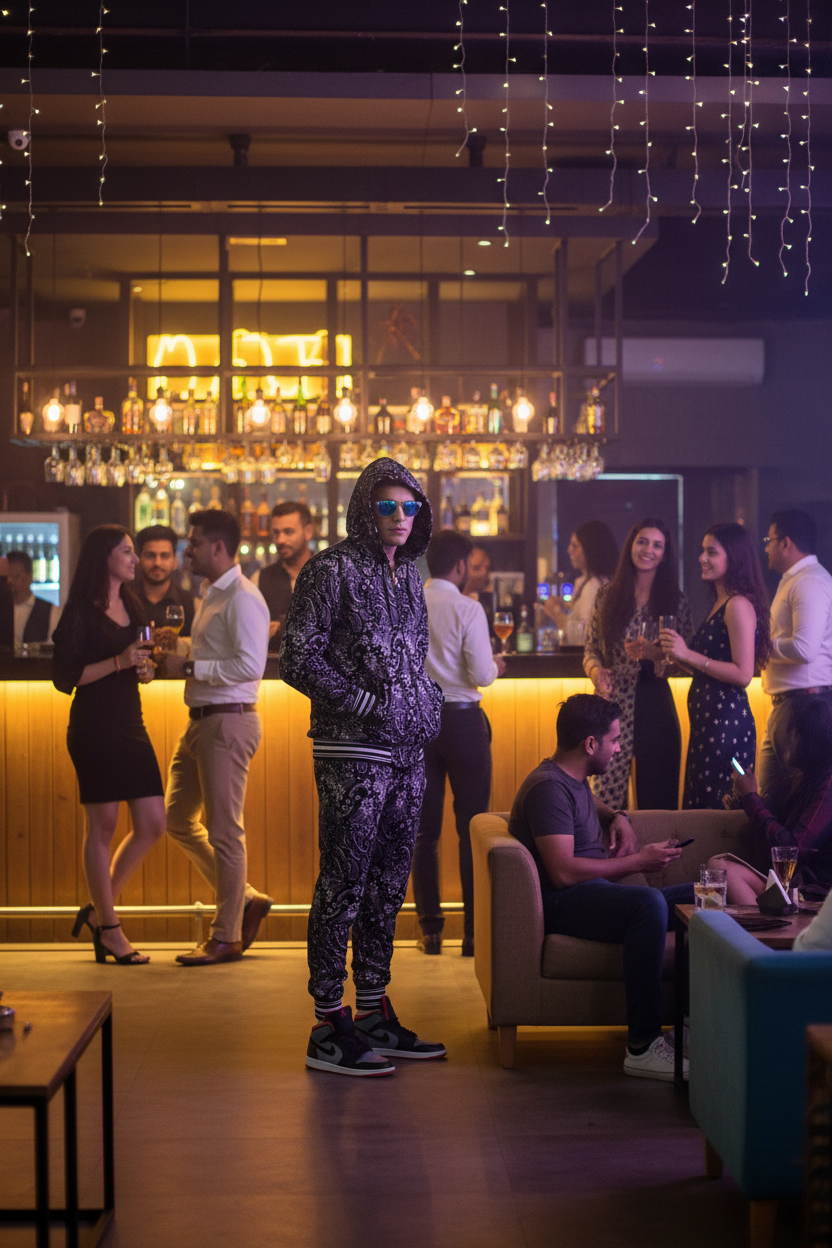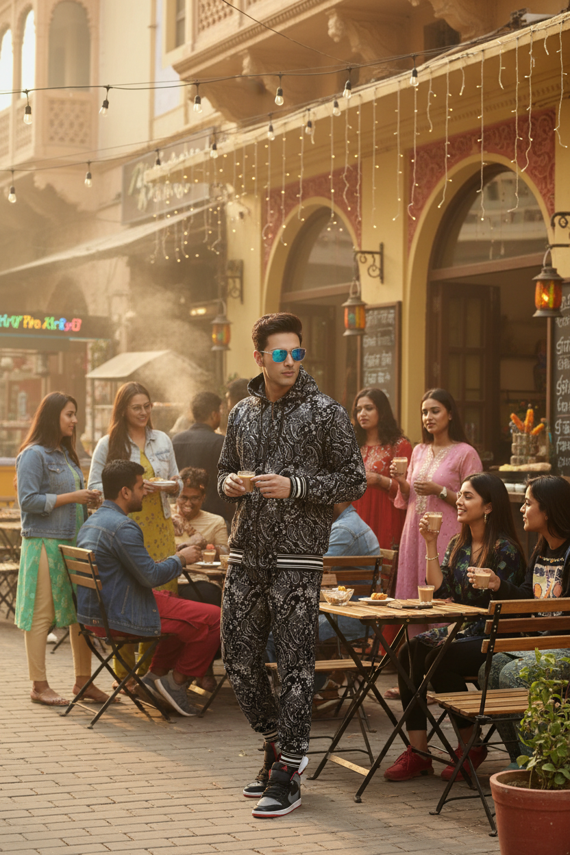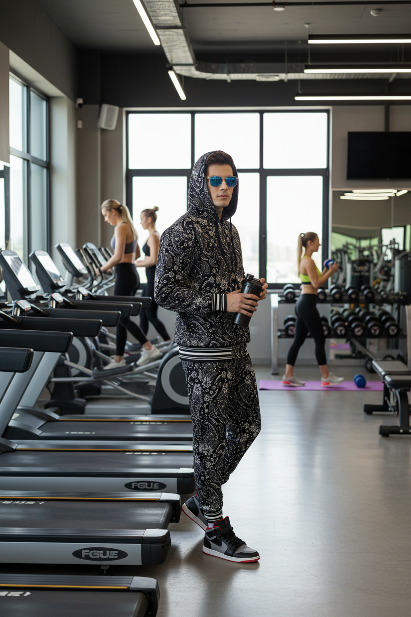 Paisley Design Printed Black Zipper Hoodie Cord Set for Men