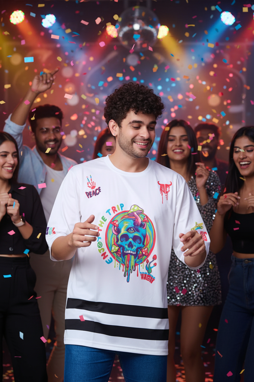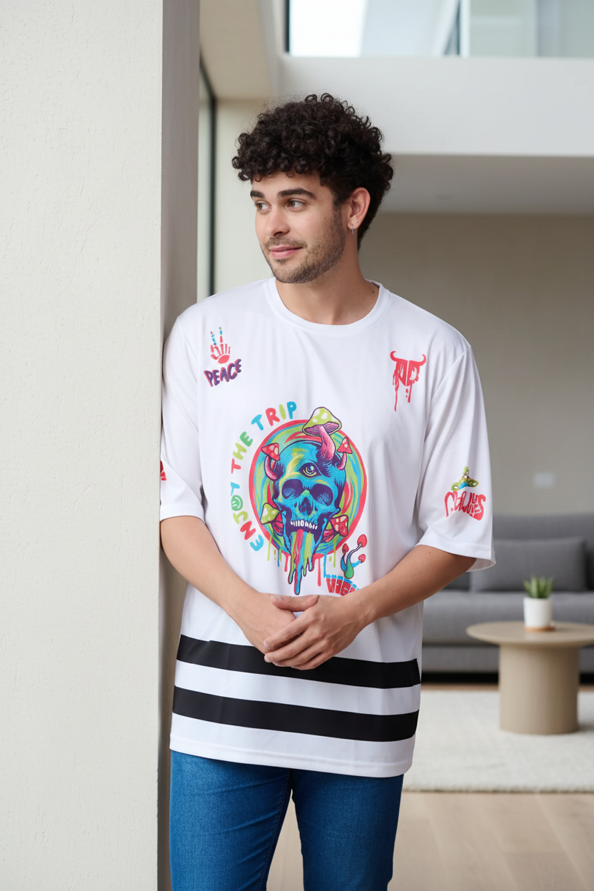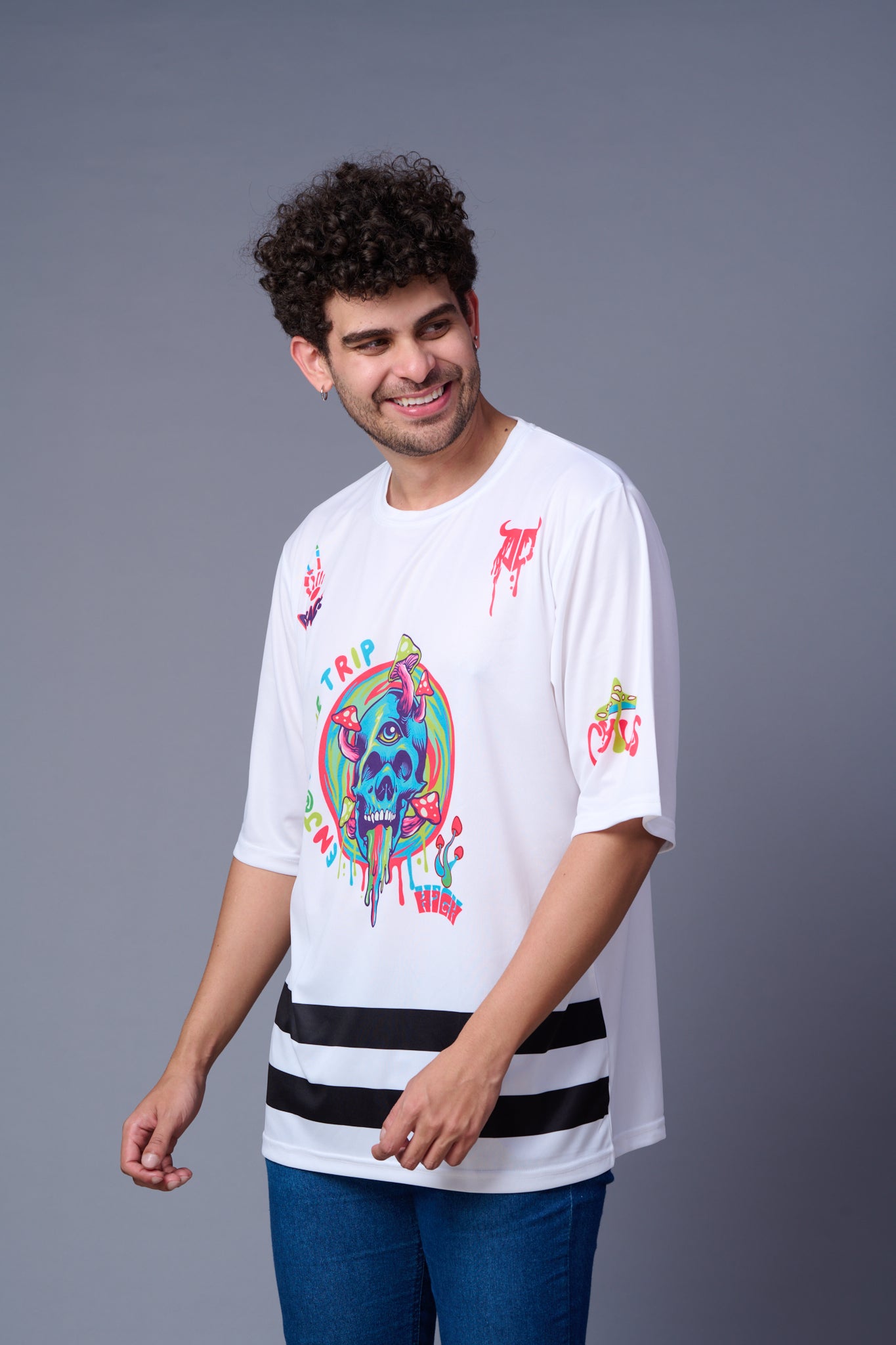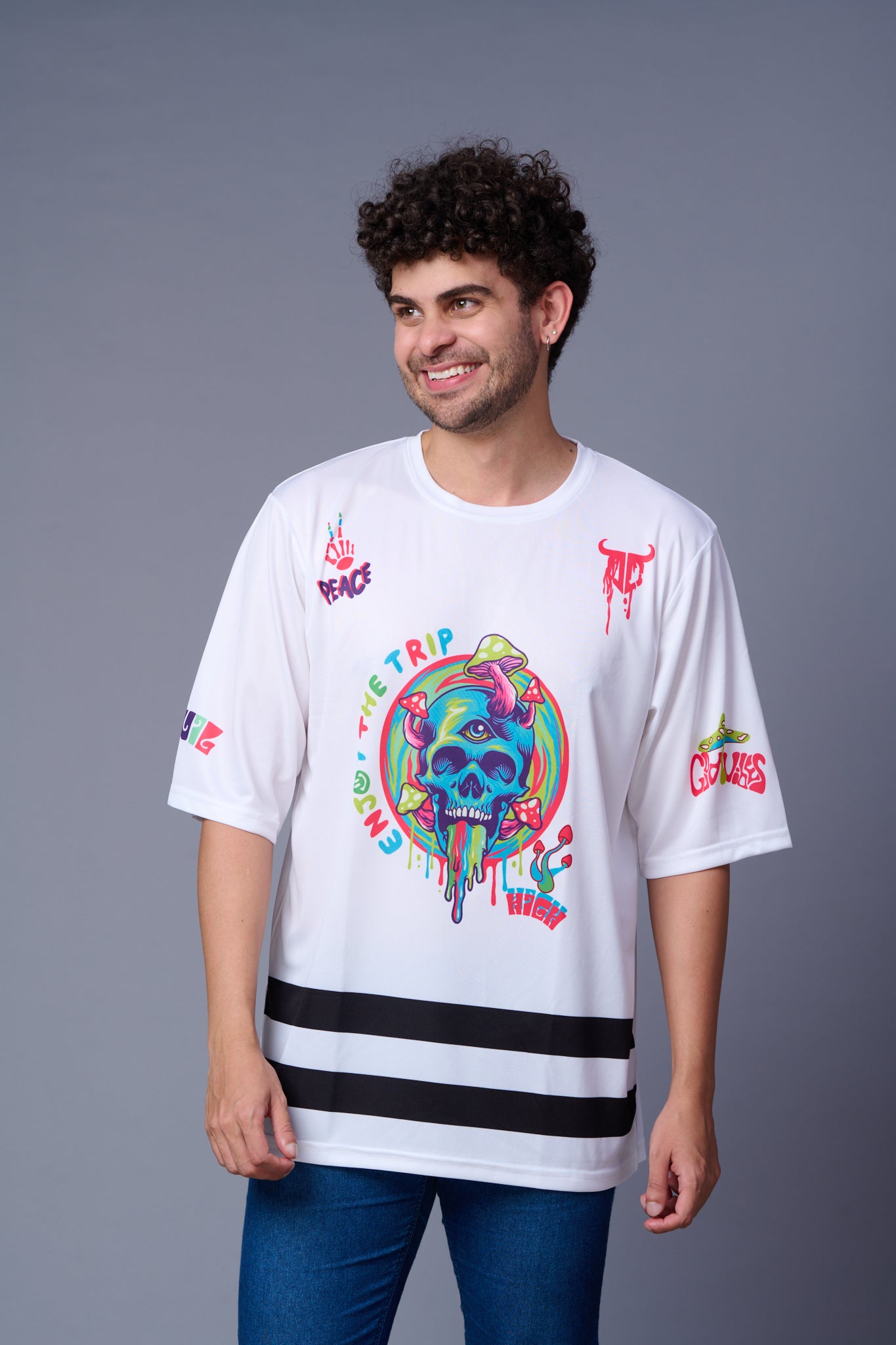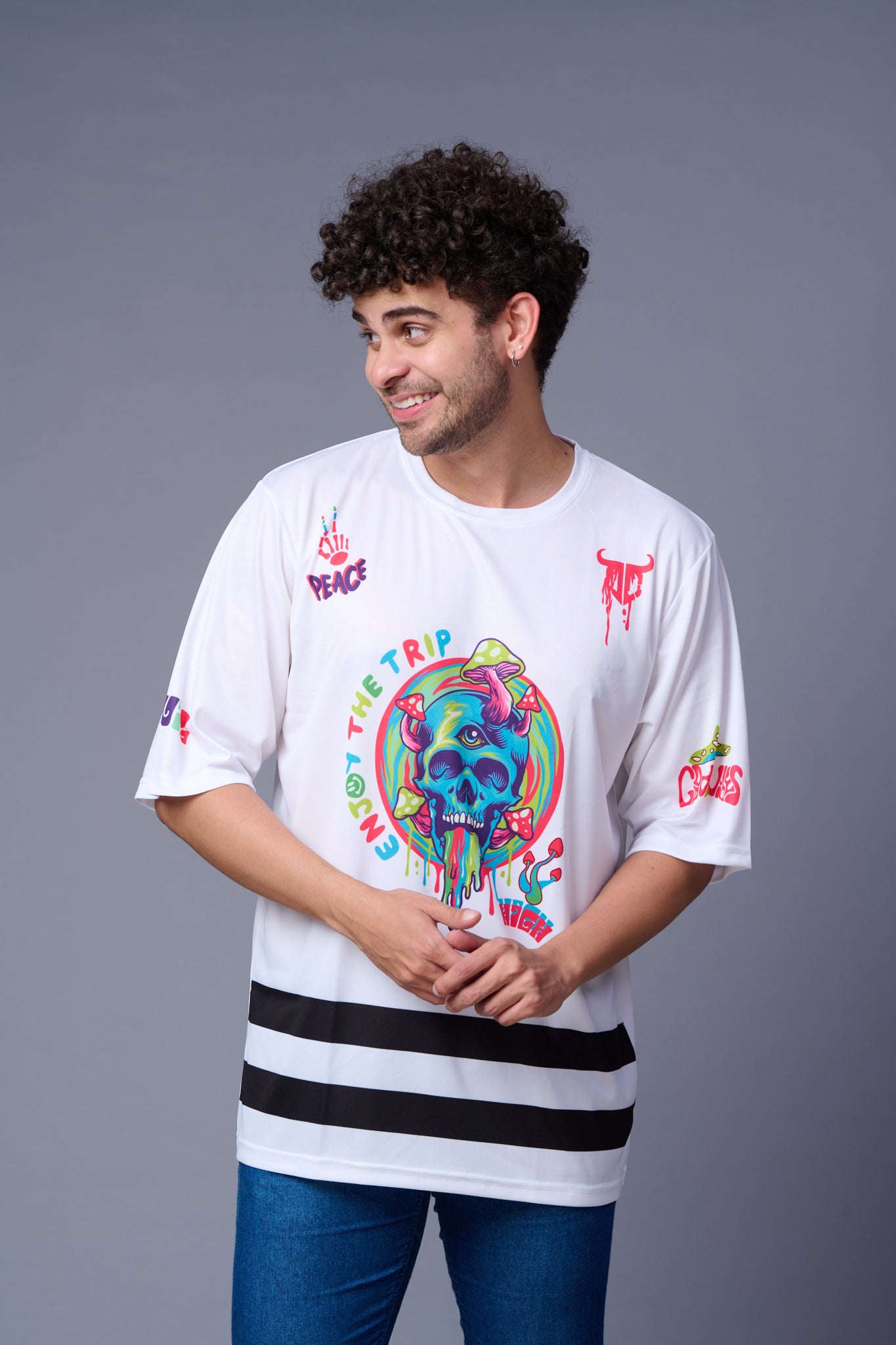 Skull With Enjoy The Trip Printed White Oversized Jersey T-Shirt for Men
